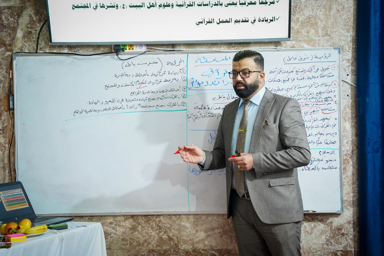 نظّم معهدُ القرآن الكريم فرع بابل التابع للمَجمَع العلميّ للقرآن الكريم في العتبة العبّاسية المقدّسة، دورةً تخصصيّةً في التخطيط الاستراتيجي لملاكاته الإدارية والتدريسية، حاضر فيها الدكتور محمد المعموري، وذلك بهدف تطوير الكفاءات وتعزيز القدرات التخطيطية في العمل القرآني. وقال مسؤول فرع بابل السيّد منتظر المشايخي: "إنّ هذه الدورة تأتي ضمن رؤية المعهد الرامية إلى الاستثمار الأمثل في الطاقات القرآنية، عبر تمكين ملاكاته بالمهارات الإدارية الحديثة التي تُسهم في تعزيز جودة العمل وضمان استمراريته، بما ينسجم مع التوجّهات العامة للمَجمَع العلميّ للقرآن الكريم". وبيّن المشايخي: "أنّ تنظيم مثل هذه الدورات ينسجم مع النهج الذي تتبنّاه العتبة العباسية المقدّسة في دعم البرامج القرآنية علميًا وإداريًا"، موضحًا: "أنّ الدورة شهدت تفاعلًا واسعًا من المشاركين لما تضمّنته من محاور عملية تُسهم في صياغة خطط واضحة للمشاريع المستقبلية".