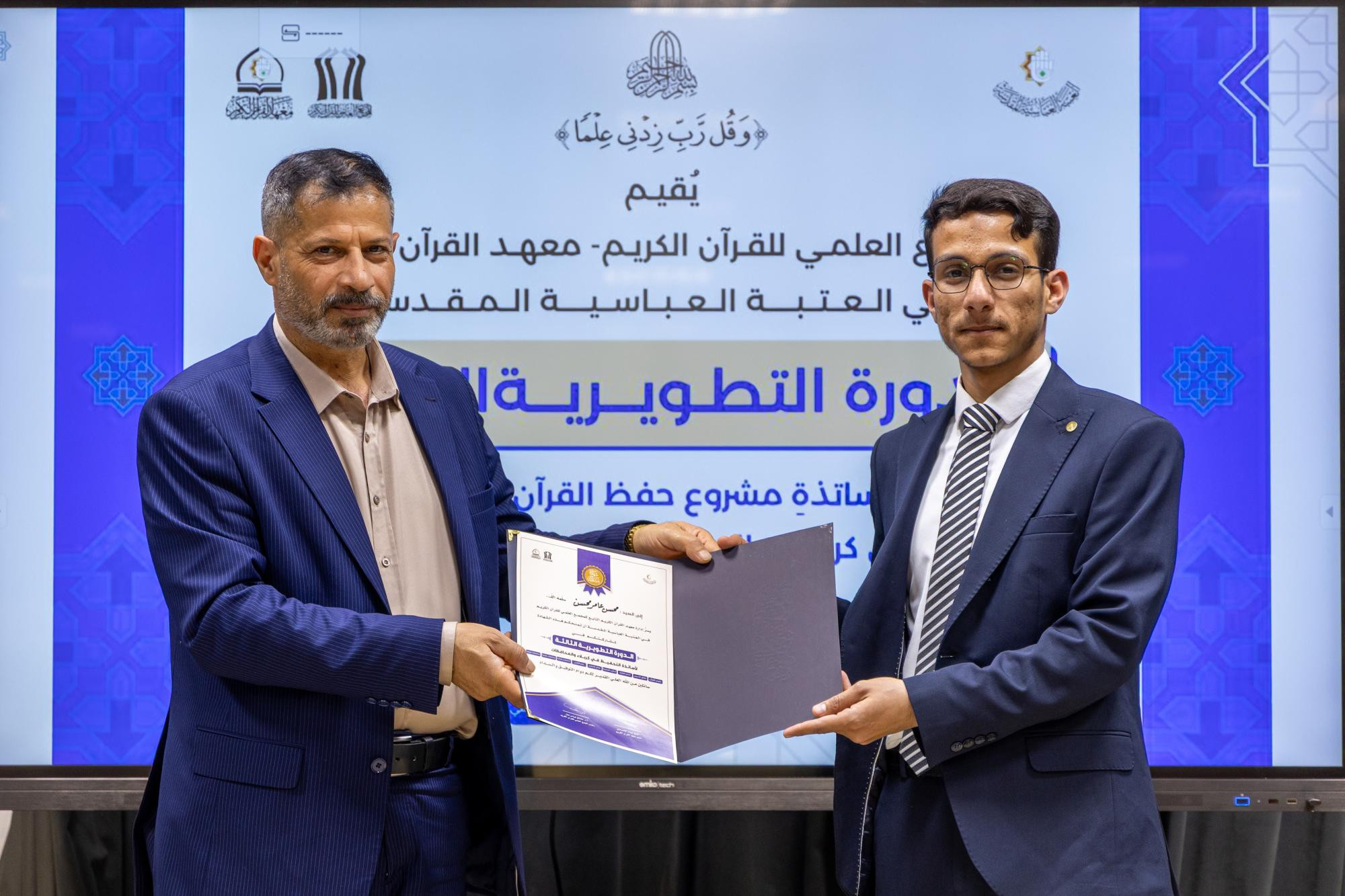 اختتم المجمع العلمي للقرآن الكريم في العتبة العباسية المقدسة الدورة التطويرية الثالثة لأساتذة مشروع حفظ كتاب الله في محافظة كربلاء. وقال مدير معهد القرآن الكريم في كربلاء التابع للمجمع، الشيخ جواد النصراوي: إنّ "المعهد اختتم الدورة التطويرية الثالثة الخاصة بأساتذة مشروع حفظ القرآن الكريم، التي أشرف على التدريس فيها نخبة من الأساتذة الأكاديميين، إذ قدموا محاضرات في علوم القرآن، وطرائق التدريس، وأحكام التلاوة، وأساليب التحفيظ، ولوائح التحكيم، وعلم النفس، والمفاهيم القرآنية، ومحاضرات علمية وتربوية". وأضاف، أنّ "الدورة أُقيمت في مقر المعهد بكربلاء استمرت ثمانية أيام، بواقع يومين في الأسبوع، وشارك فيها أكثر من 55 أستاذًا من أساتذة مشروع حفظ القرآن الكريم الموزعين في كربلاء والمحافظات". وبيّن النصراوي، أنّ "المعهد يهدف من إقامة هذه الدورة إلى تطوير مهارات الأساتذة، وزيادة معارفهم، وتعزيز قدرتهم على إدارة حلقات مشروع الحفظ، وضمان ديمومة العمل القرآني واستمراره بأفضل صورة". وأوضح، أنّ "حفل الختام شهد فقرات متنوعة، منها تلاوة افتتاحية للحافظ حسين القزويني، وكلمة للمعهد ألقاها مسؤول وحدة التحفيظ فيه الشيخ علي الرويعي، استعرض فيها تفاصيل الدورة وأهدافها، وأهمية استمرار تطوير المهارات لدى أساتذة التحفيظ، تلتها تلاوة جماعية قدمها مجموعة من طلبة مشروع حفظ القرآن الكريم في كربلاء، واختُتم الحفل بتوزيع الشهادات التقديرية والهدايا على أساتذة الدورة وطلبتها".