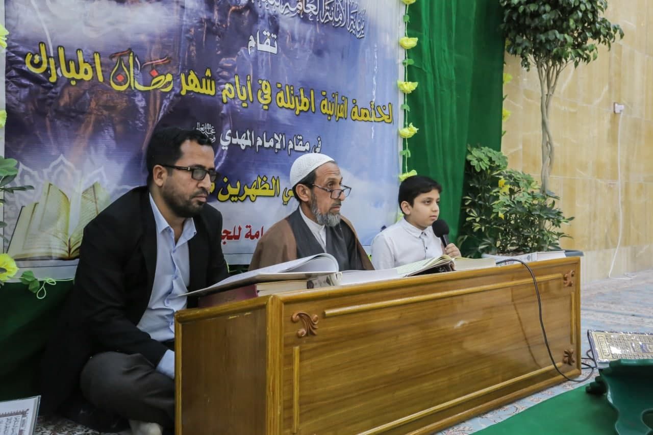 اقامت الامانة العامة للعتبة العباسية المقدسة، ختمة قرآنية رمضانية مرتلة، بمقام الإمام المهدي المنتظر (عج) بمشاركة عدد من قراء وحفظة معهد القرآن الكريم، وبحضور جمع من المؤمنين. الختمة تقام يوميًا بعد صلاة الظهرين، ويقرأ فيها جزء من القرآن الكريم، حيث تمت تهيئة مكان مخصص من المقام الشريف زود بالمصاحف ليتمكن المشاركون من المتابعة مع القراء في إتمام القراءة، وتأتي هذه الختمة ضمن البرامج القرآنية التي أعدها المعهد خلال ايام الشهر الفضيل. يذكر أن معهد القرآن الكريم في العتبة العباسية المقدسة قد أعد منهاجاً لإحياء أيام وليالي شهر رمضان المبارك من خلال إقامته للختمات القرآنية أو المسابقات وغيرها، سواءً في المعهد أو في فروعه المنتشرة بأغلب محافظات العراق.