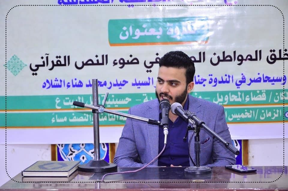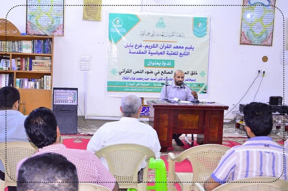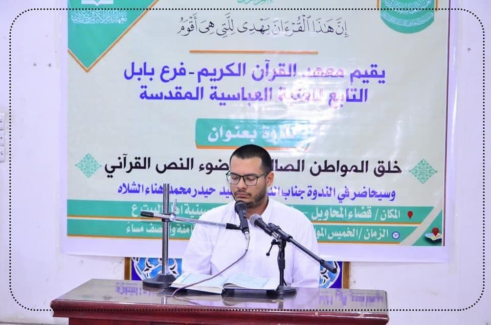 نظم معهد القرآن الكريم فرع بابل التابع للعتبة العباسية المقدسة، ندوة قرآنية بعنوان (خلق المواطن الصالح في ضوء النص القرآني)، تناولت مجموعة من الآيات القرآنية المباركة التي تبني المجتمع وترتقي به نحو الفلاح، قدمها الدكتور حيدر الشلاه أحد اساتذة جامعة بابل كلية العلوم الإسلامية. الندوة أقيمت في قضاء المحاويل منطقة الفندية، واتخذت فيها الاجراءات الوقائية والتباعد المكاني، خوفًا من تداعيات كورونا، كما تعد هذه الندوة واحدة من الندوات التي أعدها فرع المعهد خلال شهر رمضان المبارك، وهي تستهدف الشباب وعدد من فئات المجتمع الأخرى. يذكر أن معهد القرآن الكريم في العتبة العباسية المقدسة، أقام عدد من النشاطات والمشاريع القرآنية خلال شهر رمضان احياءً لأيام وليالي الشهر الفضيل، ونشر موائد الذكر بين فئات المجتمع.