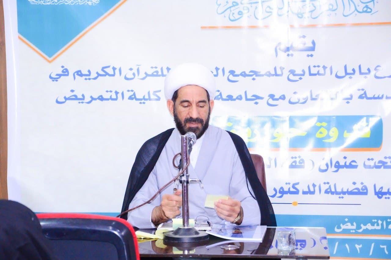 نظّم معهد القرآن الكريم فرع بابل التابع للمجمع العلمي للقرآن الكريم في العتبة العباسية المقدسة بالتعاون مع كلية التمريض في جامعة بابل، ندوة حوارية بعنوان (فقه الشباب الجامعي)، حاضر فيها الشيخ الدكتور حسن المعموري وبيّن خلالها جملة من المسائل لطلبة التمريض التي تبيّن لهم الصواب والصلاح.