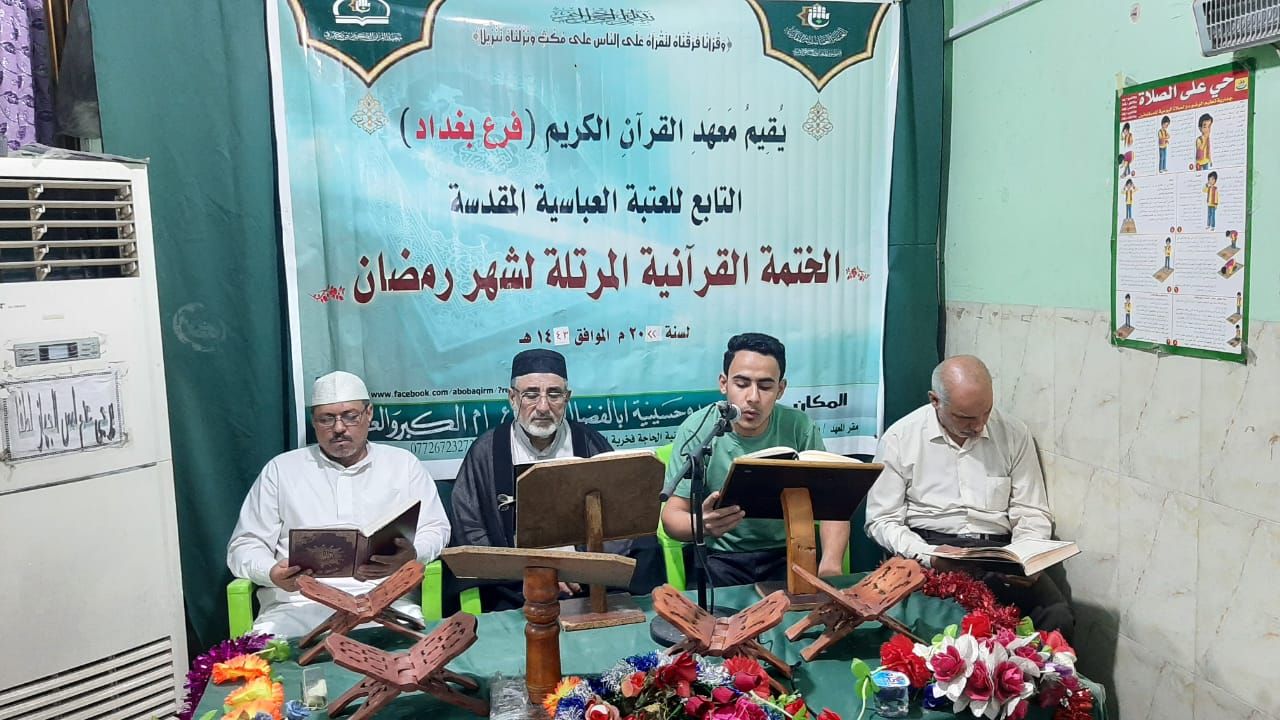 أحتشد المؤمنون حول مائدة الكتاب العزيز في أكثر من 50 ختمة قرآنية رمضانية مرتلة، التي يقيمها معهد القرآن الكريم فرع بغداد التابع للمجمع العلمي للقرآن الكريم في العتبة العباسية المقدسة، وتوزعت في أغلب مناطق العاصمة بغداد وبجانبيها الكرخ والرصافة. الختمات انطلقت منذ حلول شهر رمضان المبارك، وتوزعت على مساجد وحسينيات مدينة بغداد وضواحيها، بمشاركة نخبة من قرّاء الفرع يرتلون الكتاب العزيز أناء الليل وأطراف النهار، وبأجواء قرآنية رمضانية اجتمع فيها المؤمنون ليتزودوا من معين القرآن الكريم. يذكر أن معهد القرآن الكريم وفروعه في المحافظات يقيمون العديد من البرامج والنشاطات القرآنية، التي تنوعت بين القرآنية والمعرفية، إذ منها ندوات فكرية، وختمات مرتلة، ومحافل قرآنية، مضافًا إلى المسابقات الرمضانية.