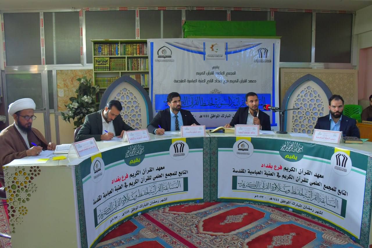 أطلق معهد القرآن الكريم فرع بغداد التابع للمجمع العلمي للقرآن الكريم في العتبة العباسية المقدسة، المسابقة القرآنية السنوية لحفظ القرآن الكريم بنسختها السابعة، وشارك فيها أكثر من (30) حافظًا يتنافسون فيما بينهم بتلاوة أجزاء متفاوتة حفظًا من الكتاب العزيز.rnالمسابقة افتتحت بتلاوة للقارئ (حسين الغزي)، جاء بعدها قراءة سورة الفاتحة على أرواح شهدائنا الأبرار، أعقبها كلمة لمدير معهد القرآن الكريم الشيخ جواد النصراوي التي رحب فيها بالحاضرين والمتسابقين، وبيّن أهمية العناية بكتاب الله العظيم سواء في أيام شهر رمضان أو غيرها من الأيام، موضحًا الخطة التي أعدها المعهد لإحياء ليالي الشهر الفضيل التي تهدف إلى إشاعة ثقافة الثقلين الشريفين بين المجتمع.rnأعقبها الشروع بالمسابقة التي قسمت منافستها إلى حفظ ثلاثة أجزاء، وخمسة أجزاء، وعشرة أجزاء، وأشرف عليها لجنة مختصة، وفي ختامها تم إعلان النتائج للفائزين الثلاثة الأوائل من كل فئة وتكريمهم، وكذلك تكريم بقية المتسابقين المشاركين تشجيعاً لهم على بذل المزيد في المسابقات القادمة.