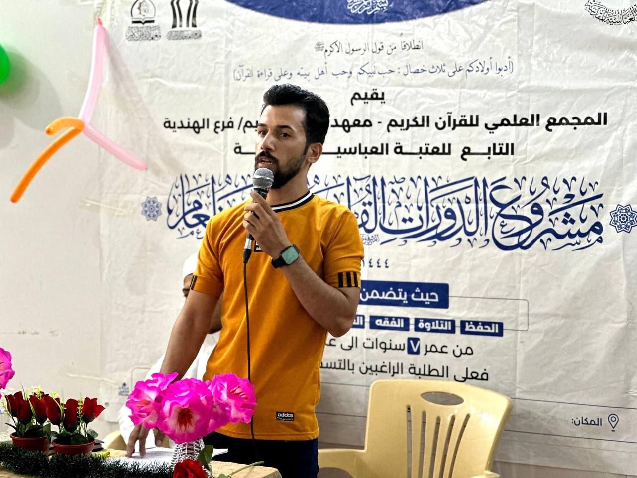 أحيا معهد القرآن الكريم فرع الهندية التابع للمَجمَع العلميّ للقرآن الكريم في العتبة العباسية المقدسة، ذكرى عيد الغدير الأغر بمحفلٍ قرآنيّ في أحد الامكان التي يقــام فيها مشروع الدورات الصيفية.rnافتتح المحفل بتلاوة لأحد طلبة الدورات، ثم شهد العديد من القصائد والأناشيد من الطلبة، كما شهد المحفل كلمة لمسؤول الفرع السيد (حامد المرعبي) بيّن فيها فضائل الإمام علي بن أبي طالب -عليه السلام-، وأهمية بيعة يوم الغدير، وسط حضور كبير من طلبة الدورات، والأساتذة، واهالي المنطقة.