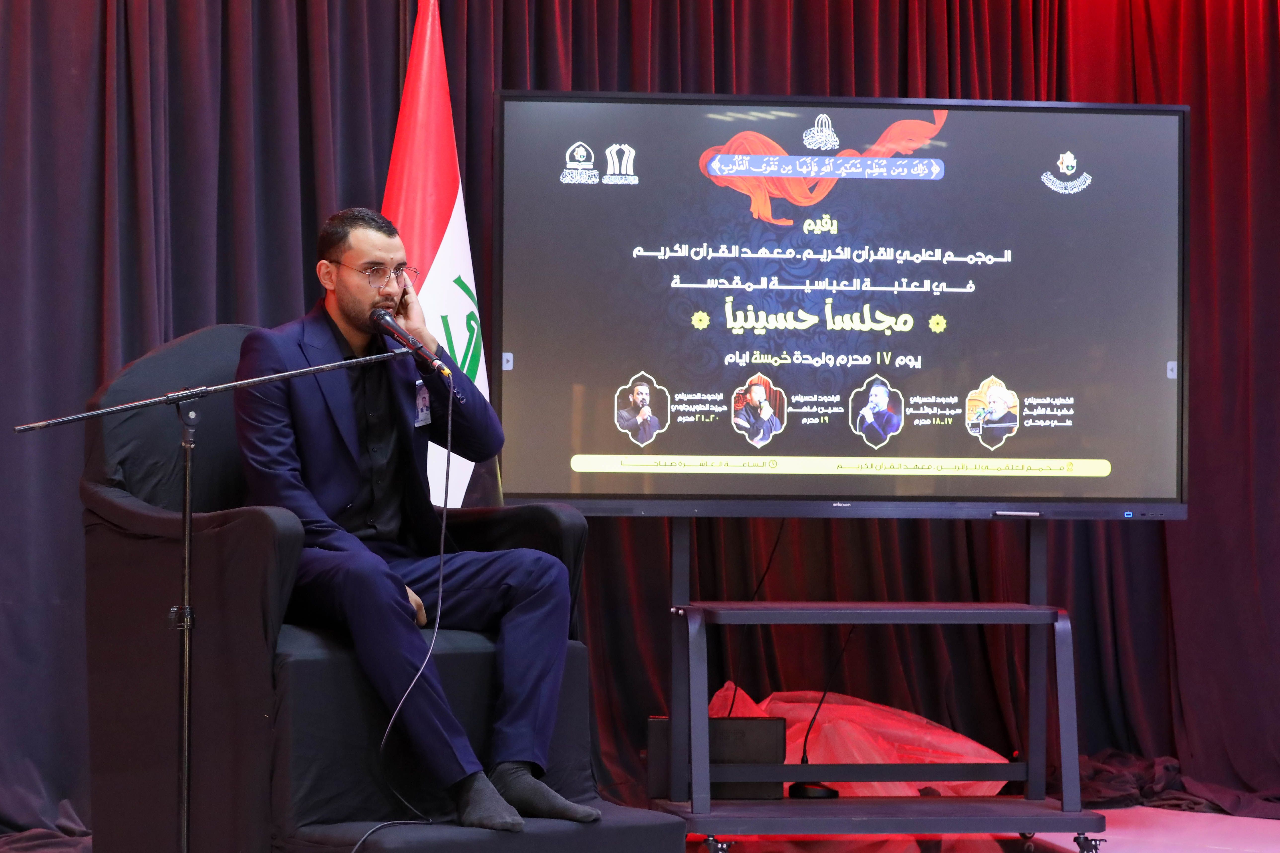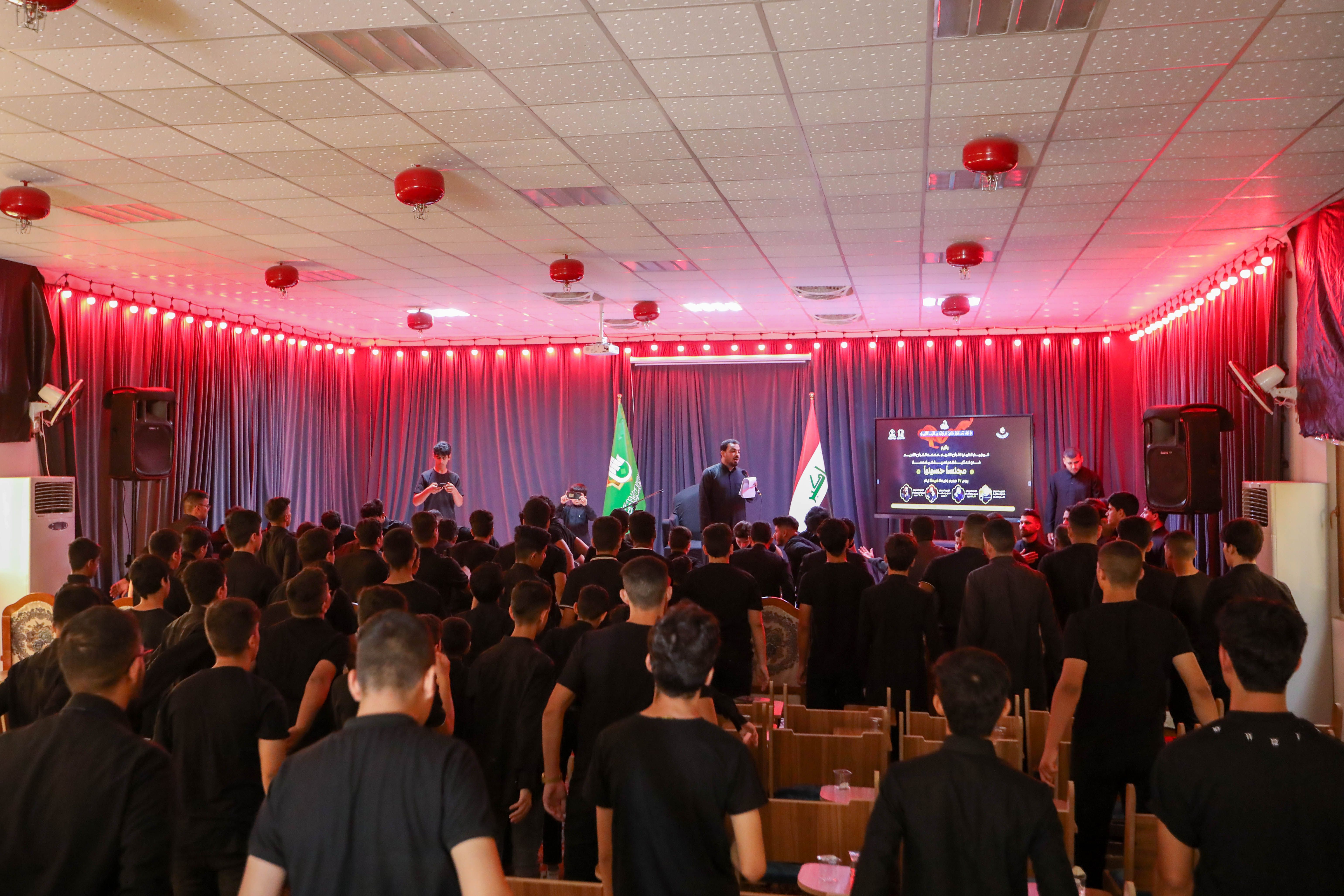 اختتم معهد القرآن الكريم التابع للمَجمَع العلميّ للقرآن الكريم في العتبة العباسية المقدسة، مجلس العزاء العاشورائي، الذي أقيم تأبينًا لذكرى استشهاد الإمام الحسين -عليه السلام-، وقدمه فضيلة الشيخ علي موحان، وتناول فيه جملة من الدروس المستلهمة من واقعة الطف الأليمة rn المجلس أقيم في مجمع العلقمي للزائرين، وحضره جمع من أساتذة وطلبة المعهد، واستمرت محاضراته لمدة (5) أيام متتالية، قدمت فيها قيم قرآنية سامية جسدها الإمام الحسين -عليه السلام- وأصاحبه في كربلاء، كما ارتقى المنبر مجموعة من الرواديد وهم كل من (سمير الوائلي، والسيد حميد الطويرجاوي، حسين فاهم الإبراهيمي) rnيذكر أن معهد القرآن الكريم يسعى من خلال هذه البرامج إلى خلق جو قرآني حسيني عند طلبته، يستلهمون من خلاله دروسًا وعبرًا عمادها فكر الثقلين الشريفين.rnrnrn