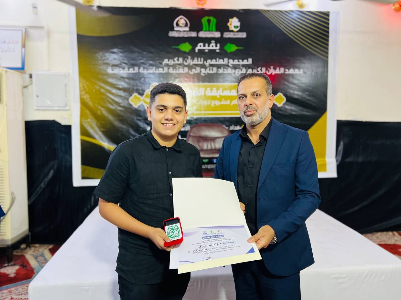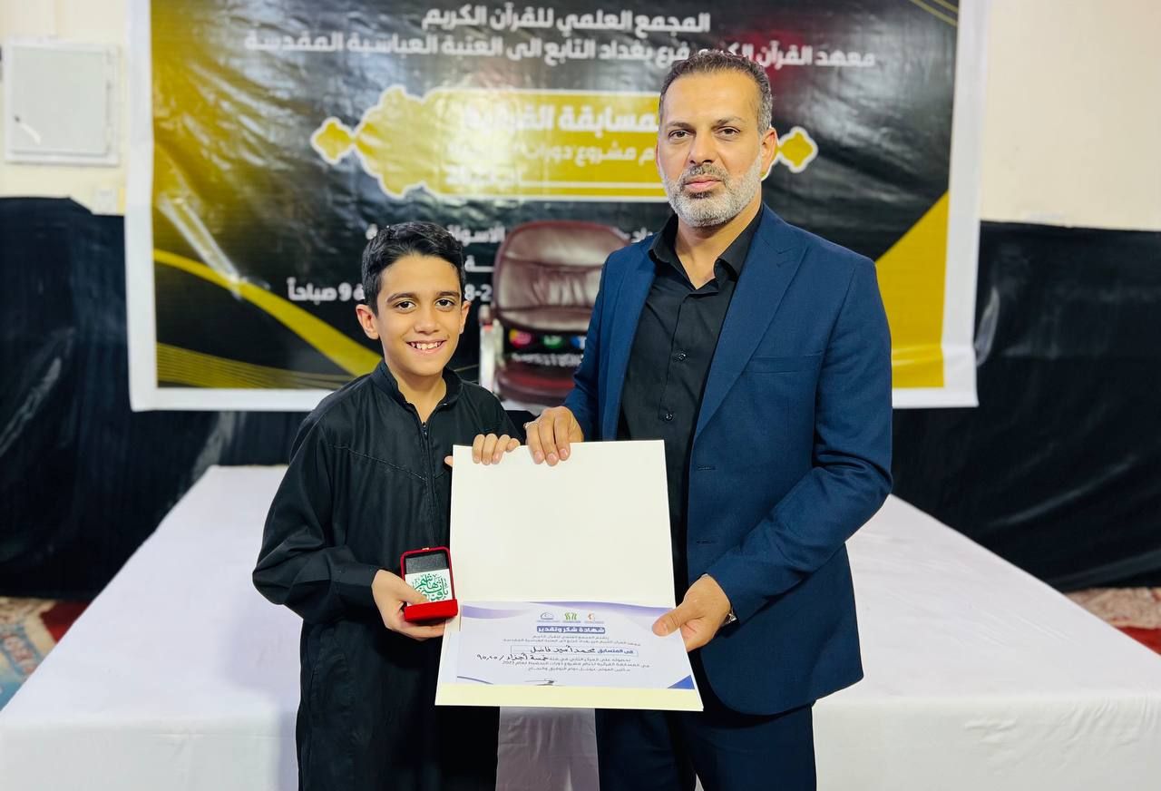 rnأقام معهد القرآن الكريم فرع بغداد التابع للمَجمَع العلميّ للقرآن الكريم في العتبة العباسية المقدسة المسابقة القرآنية ختامًا لدورات الحفظ لعام 2023 بمشاركة طلبة المشروع في بغداد. rnrnالمسابقة تضمنت مشاركة عدة فئات من الطلبة بهدف تنمية مهاراتهم، وتحفيزهم على الحفظ المستمر لكتاب الله العزيز بغية إعداد جيل قرآني من الفتية والشباب، وبعد التنافس الفاعل بين الطلبة، وحصل عدد منهم على مراكز متقدمة، وحدد القائمين على المسابقة فئات الحفظ ابتداءً من ثلاثة أجزاء، إلى فئة عشرون جزءاً، وفي ختام المسابقة تم تكريم المشاركين بشهادات تقديرية، وهدايا تشجيعية.