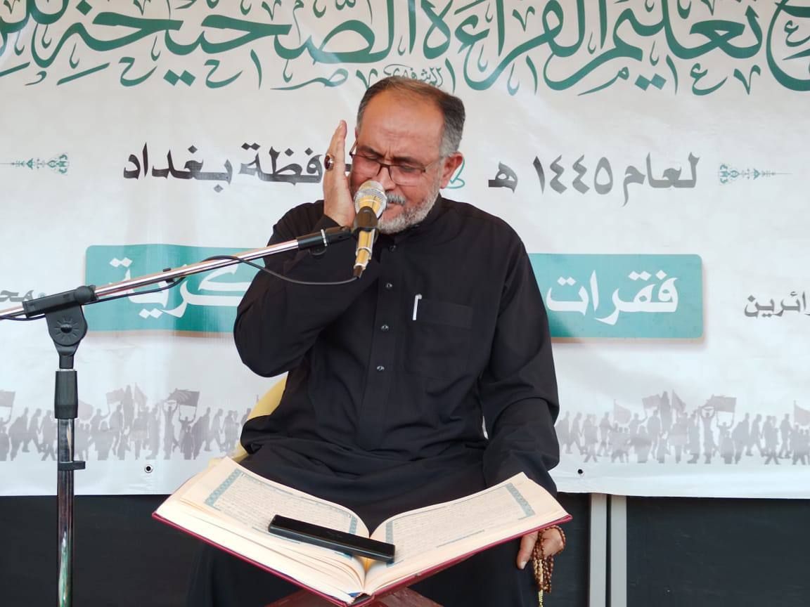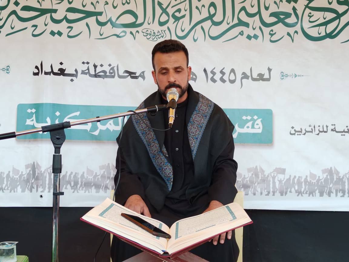 أقام المجمع العلمي للقرآن الكريم في العتبة العباسية المقدسة محفلاً قرآنياً مباركاً ضمن مشروع تعليم القراءة الصحيحة في قضاء الحسينية بالعاصمة بغداد على طريق الزائرين المتوجهين إلى مدينة كربلاء المقدسة لإحياء زيارة الأربعين. rnrnوأشرف على إقامة المحفل معهد القرآن الكريم فرع بغداد التابع للمجمع.rnrnوأفتتح المحفل بتلاوة للقارئ (أبو سيف المحمداوي)، ثم تلاوة للقارئ (أحمد العامري)، أعقبها محاضرة دينية ألقاها الشيخ (حسين الحمراني)، أكد خلالها على ضرورة الاهتمام بالقرآن الكريم من خلال تعلم قراءته بصورة متقنة، واكتساب معارفه، وعلومه الكثيرة.