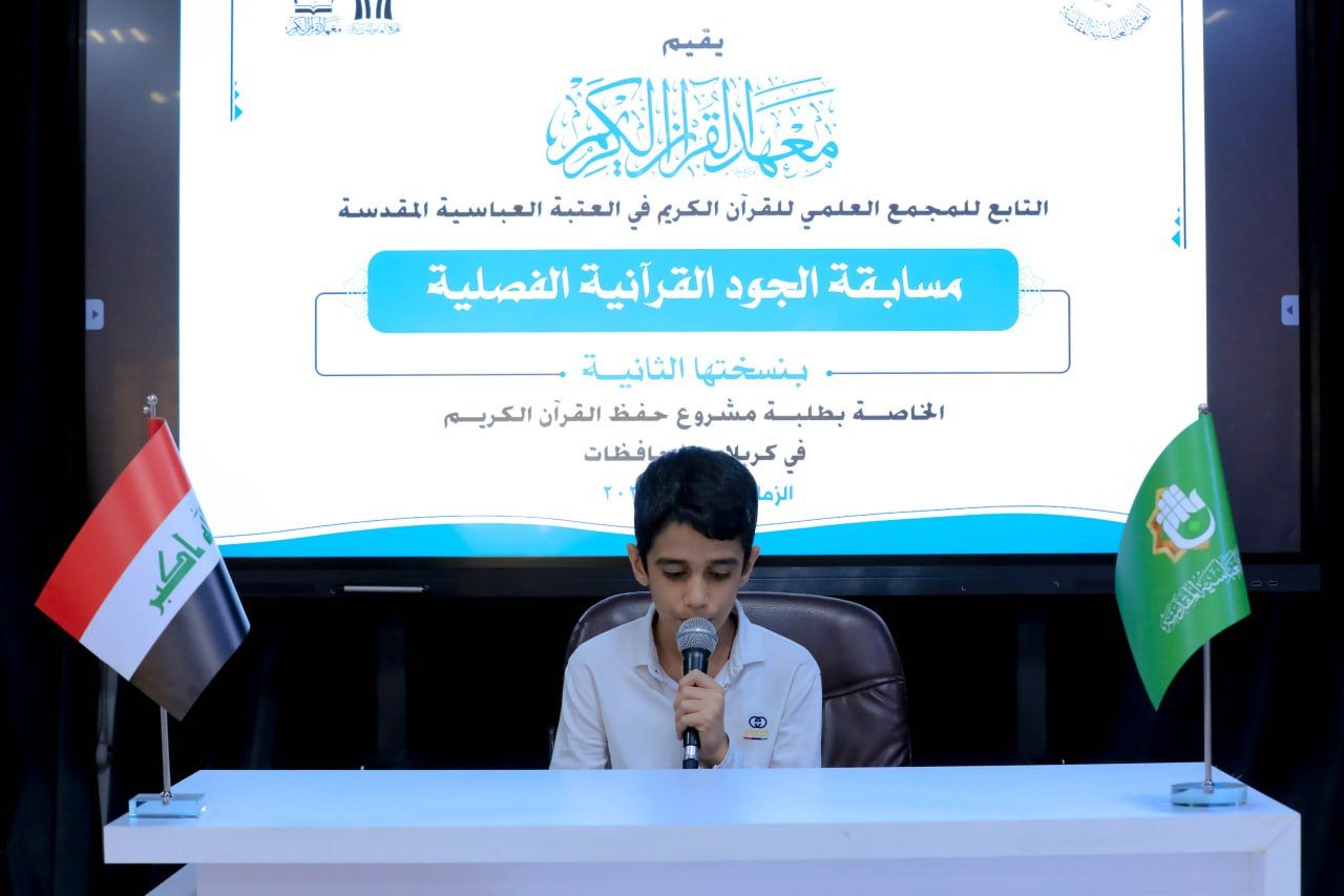 انطلقت صباح اليوم السبت فعاليات مسابقة الجود القرآنية الفصلية الخاصة بطلبة مشروع حفظ القرآن الكريم الذي يقيمه معهد القرآن الكريم التابع للمجمع العلمي للقرآن الكريم في كربلاء المقدسة والمحافظات.rnالمسابقة تقام في مقر المعهد بمجمع العلقمي للزائرين ويشارك فيها 60 حافظاً من طلبة المعهد في كربلاء المقدسة وفروعه في المحافظات موزعين على ست فئات هي 3 أجزاء، و5 أجزاء، و10 أجزاء، و15 جزءًا، و 20 جزءًا، 25 جزءًا.rnويشرف على تحكيم المسابقة لجنة مختصة ضمت كل من (الحافظ قاسم حامي عن جودة الحفظ، والأستاذ الدكتور حيدر الشلاه عن الوقف والابتداء والأستاذ علاء الدين حمود عن أحكام التلاوة والقارئ السيد حيدر جلوخان عن الصوت والنغم).rnالمسابقة تهدف إلى كشف مستويات حفظ الطلبة وتحفيزهم للتنافس في إتمام مشوار حفظ كتاب الله العزيز كما أنها تسهم في زيادة جاهزيتهم واستعدادهم للمشاركة في المسابقات المحلية والوطنية.