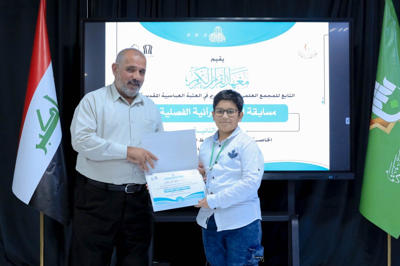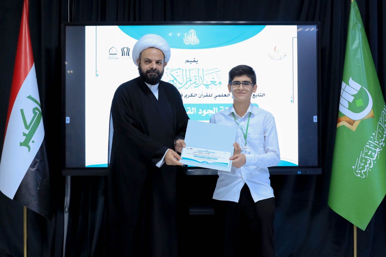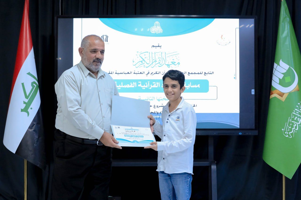 اختتمت مساء اليوم السبت فعاليات مسابقة الجود القرآنية الفصلية الخاصة بطلبة مشروع حفظ القرآن الكريم الذي يقيمه معهد القرآن الكريم التابع للمجمع العلمي للقرآن الكريم في كربلاء المقدسة والمحافظات.rnالمسابقة أقيمت في مقر المعهد بمجمع العلقمي للزائرين وشارك فيها 60 حافظاً من طلبة المعهد في كربلاء المقدسة وفروعه في المحافظات موزعين على ست فئات هي 3 أجزاء، و5 أجزاء، و10 أجزاء، و15 جزءًا، و 20 جزءًا، 25 جزءًا.rnوكانت نتائج المسابقة بحسب الترتيب الآتيrnفئة (٣) أجزاء rn١- إبراهيم علي موسىrn٢- علي محمد كريمrn٣- محمد هاني غريبrnفئة (٥) أجزاء rn١- موسى حيدر طالبrn٢- صالح مهدي عيدانrn٣- محمد حمزة داخلrnفئة (١٠) أجزاء rn١- الحسن محمد ملاrn٢- العباس محمد ملاrn٣- محمد مهدي عباسrnفئة (١٥) جزءًا rn١- علي صلاح حسنrn٢-محمد احمد رزاقrn٣- علي الرضا ستار جبارrnفئة (٢٠) جزءًا rn١- احمد هاشم حسينrn٢- محمد حيدر تركيrn٣- مهدي ستار جبارrnفئة (٢٥) جزءًا rn١- محمد رضا سلامrn٢ - محمد عباس فاضل