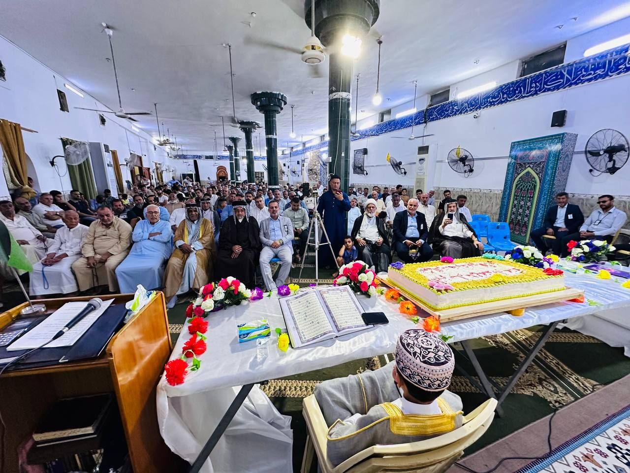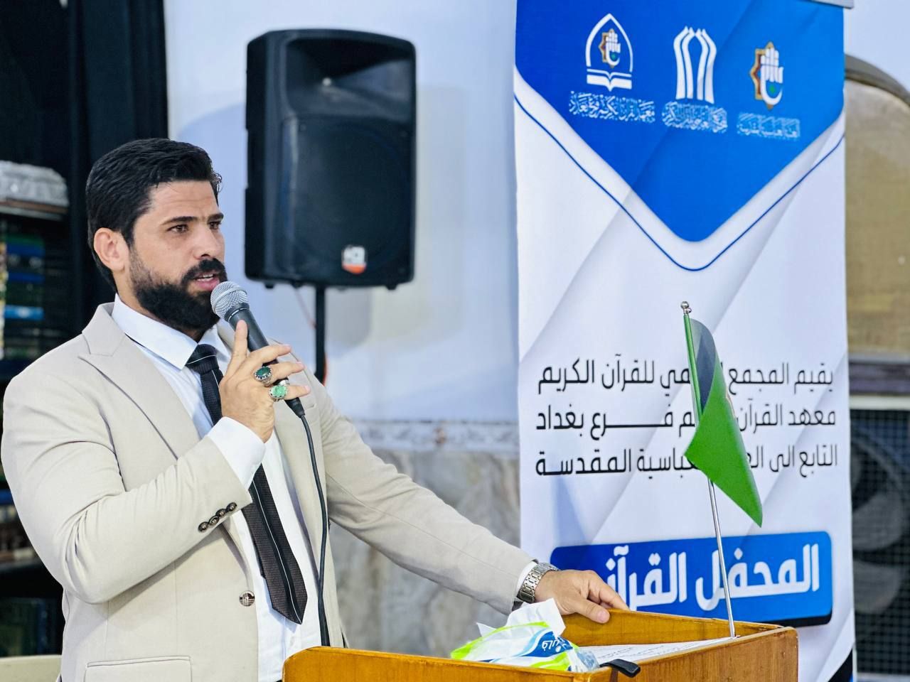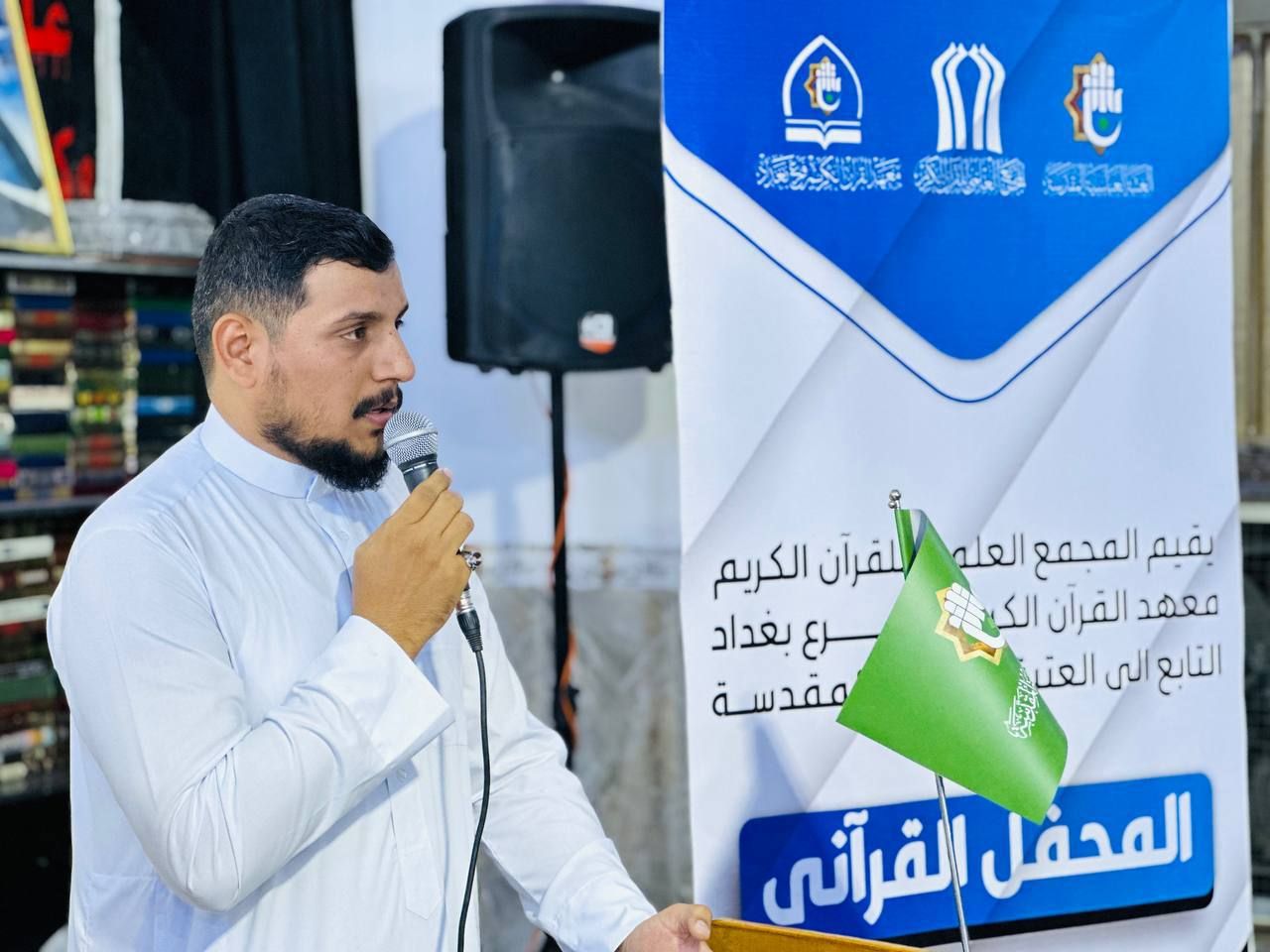 أقام المَجمَع العلميّ للقرآن الكريم في العتبة العباسية المقدسة محفلاً قرآنياً في قضاء المحمودية بالعاصمة بغداد احتفاءً بالذكرى العطرة لولادة النبي الأكرم محمد -صلى الله عليه وآله-. rnrnوأشرف على إقامة المحفل معهد القرآن الكريم فرع بغداد التابع للمَجمَع.rnأُفتتح المحفل القرآني الذي أُقيم في (جامع المحمودية الكبير) بتلاوة بصوت القارئ (علي جواد)، ثم قراءة سورة الفاتحة على أرواح الشهداء، تلاها كلمة لإمام وخطيب المسجد الشيخ (حسين نعمة الولي) تحدث فيها عن فضل هذه الأيام المباركة لذكرى ولادة المصطفى -صلى الله عليه وآله- مبيناً أهم الصفات التي ميزها الله به عن غيره من النبيين في القرآن الكريم.rnجاء بعد ذلك كلمة لمسؤول معهد القرآن الكريم فرع بغداد الأستاذ (نبيل الساعدي) أكد خلالها على أن فرع المعهد يولي اهتماماً كبيراً بإحياء المناسبات الخاصة بأهل بيت النبوة -عليهم السلام- عبر إقامة المحافل القرآنية، مستعرضاً أهم النشاطات القرآنية التي يقيمها المعهد في عموم مناطق بغداد بُغية نشر ثقافة الثقلين الشريفين بين أوساط المؤمنين. rnأعقب ذلك تلاوة عطرة بصوت القارئ الحافظ (حسين الغزي)، ثم تلاوة بصوت البرعم (كرار ليث)، واختتم المحفل بإلقاء عدد من الأبيات الشعرية والابتهالات بصوت الرادود (علي الذهبي).