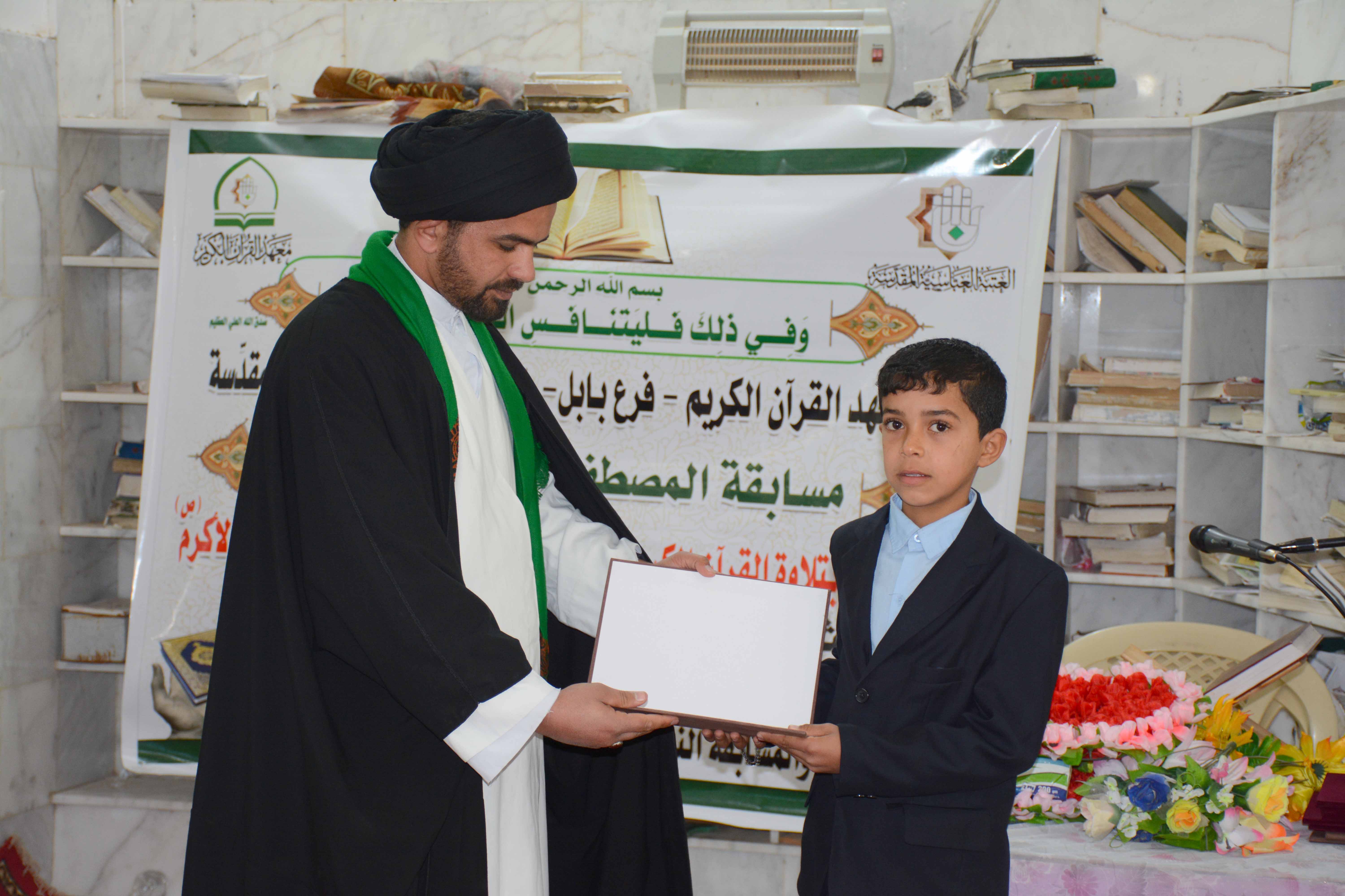 أقام معهد القرآن الكريم فرع بابل التابع للعتبة العباسية المقدسة مساء يوم السبت 5 ربيع الثاني 1437هـ الموافق 16/1/2016م مسابقة المصطفى القرآنية الثانية، وذلك في حسينية الرسول الأعظم (ص) بمنطقة العيفار في محافظة بابل، حيث شارك فيها 23 قارئ من مختلف مناطق المحافظة. أفتتحت المسابقة بتلاوة آيات من الذكر الحكيم بصوت القارئ السيد احمد الأعرجي شنف بها أسماع المؤمنين الحاضرين بأعذب التلاوات القرآنية المجودة، تلتها توجيهات لجنة التحكيم للأخوة المتسابقين لتبدأ بعدها المسابقة بتنافس كبير، أستمع الحاضرون خلالها أجمل التراتيل القرآنية وسط أجواء أيمانية وروحانية. هذا وقد أسفرت المسابقة على حصول القارئ سالم مالك جواد على المركز الأول، وحصول القارئ كريم كاظم كريم على المركز الثاني، فيما حصل القارئ عقيل خليل أبراهيم على المركز الثالث، وفي ختام المسابقة تم منح الفائزين بالمراكز الثلاثة شهادات تقديرية تثميناً لمشاركتهم المميزة، ومن جانبهم شكر المتسابقون معهد القرآن الكريم على إقامة هذه المسابقات القرآنية الفاعلة، وأثنوا على الجهود المبذولة لمعهد القرآن الكريم التي أسهمت في النهوض بالواقع القرآني في المحافظة. يشار إلى أن معهد القرآن الكريم فرع بابل يقيم العديد من المسابقات والنشاطات القرآنية المباركة التي تهدف إلى تعزيز الثقافة القرآنية في المجتمع.