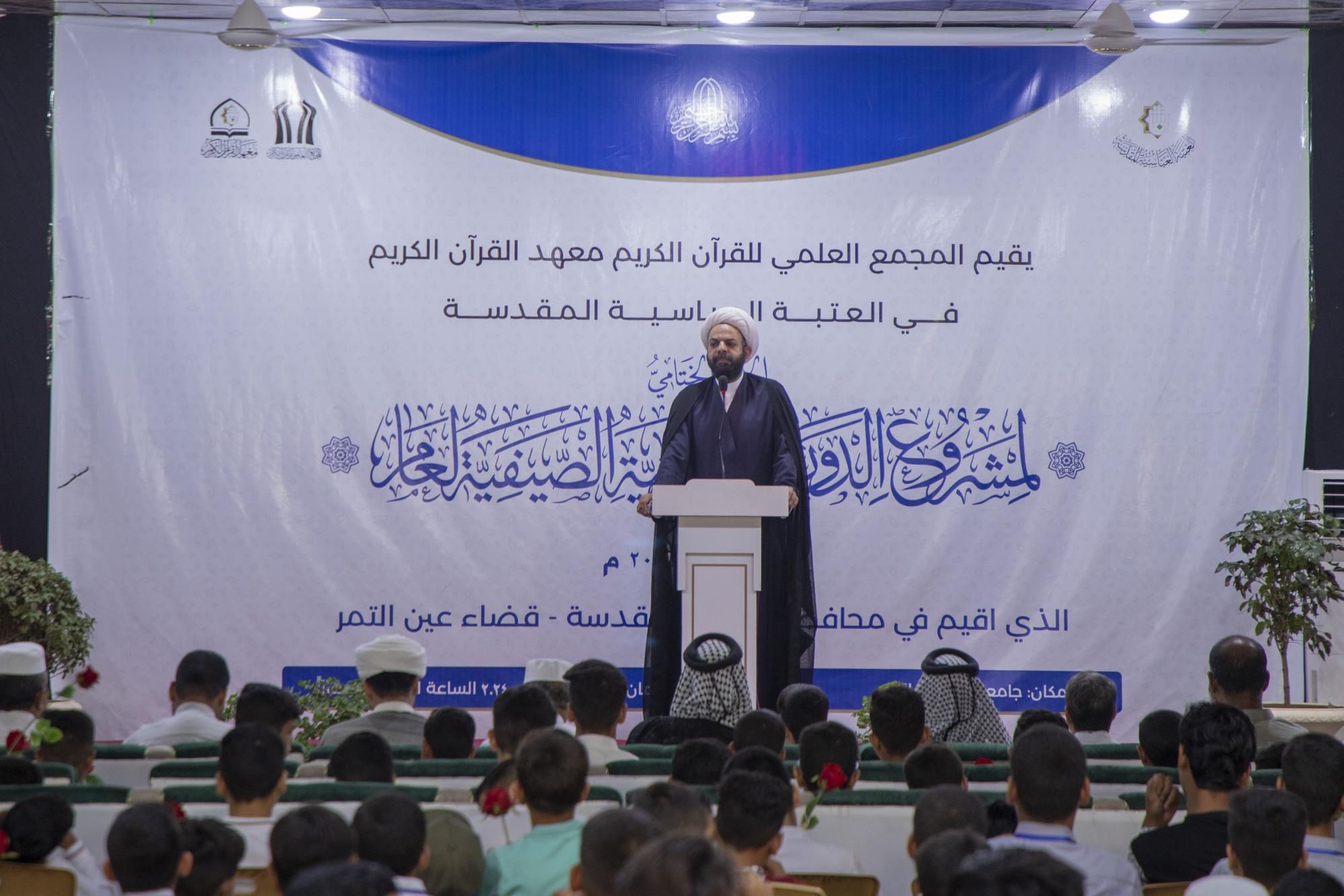 اختتم المجمع العلمي للقرآن الكريم في العتبة العباسية المقدسة، مشروع الدورات القرآنية الصيفية في قضاء عين التمر بمحافظة كربلاء المقدسة.rnrnوقال مدير معهد القرآن الكريم التابع للمجمع، الشيخ جواد النصراوي إنّ 11111المعهد أقام الحفل الختامي لطلبة مشروع الدورات القرآنية الصيفية، في قضاء عين التمر، بمشاركة أكثر من (600) طالب11111.rnrnوأضاف أنّ 11111المشروع يُقام للمرة الأولى في القضاء، بعد أن كان مقتصرًا على مركز المدينة وقضاء الهندية وبعض المناطق الأخرى، حيث قدّم الدورات أكثر من (20) أستاذًا قرآنيًّا، في (20) مسجدًا وحسينية11111.rnوأوضح النصراوي أنّ 11111الطلبة تلقوا دروسًا في الفقه، والعقائد، والأخلاق، والسيرة، إضافة إلى حفظ قصار السور11111، مشيرًا إلى أنّ 11111الهدف من ذلك يكمن في استثمار أوقات الفراغ لديهم خلال العطلة الصيفية، وتعزيز ثقافة الثقلين في نفوسهم11111.rnrnويسعى المجمع العلمي عبر مشروع الدورات الصيفية إلى تهيئة بيئة قرآنية وحاضنة إسلامية تعمل على صناعة جيل قرآني واعٍ ومتزود بالمفاهيم القرآنية وبمعارف أهل البيت (عليهم السلام).