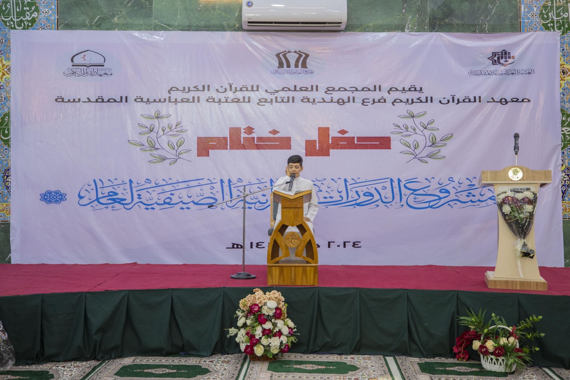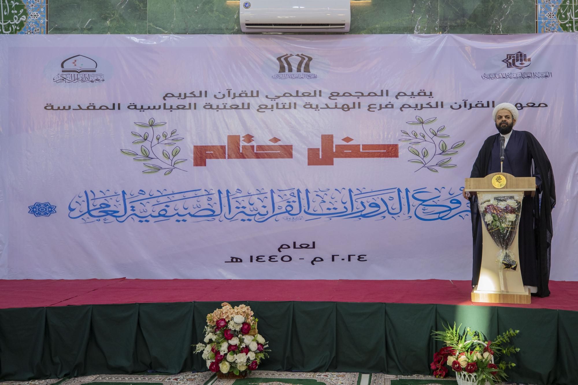 اختتم المَجمَع العلمي للقرآن الكريم في العتبة العبّاسيّة المقدّسة، مشروع الدّورات القرآنيّة الصيفيّة في قضاء الهندية بمحافظة كربلاء بمشاركة أكثر من 4500 طالب.rnrnوقال مدير معهد القرآن الكريم في كربلاء التّابع للمَجمَع الشيخ جواد النصراوي:إنّ 11111فرع المعهد في قضاء الهندية أختتم مشروع الدّورات القرآنيّة الصّيفية بمشاركة أكثر من 4500 طالب، وأقيمت في نحو 135 مسجدًا وحسينيّة توزّعت في مركز القضاء والقرى والأرياف11111.rnrnوأضاف: 11111تلقّى الطّلبة في هذه الدّورات مجموعة من الدّروس في الفقه، والعقائد، والأخلاق، وسيرة النبي محمد (صلى الله عليه وآله) وأحكام القرآن الكريم وحفظه وفهمه، إلى جانب إحياء مناسبات أهل البيت (عليهم السّلام)11111.rnمن جانبه بيّن مسؤول فرع المعهد في الهنديّة السّيد حامد المرعبي: أنّ 11111المعهد نظّم اليوم الحفل الختامي للدّورات القرآنيّة الصيفيّة لهذا العام، وبلغ عدد المستفيدين من هذه الدّورات أكثر من 4500 طالب، وقدّمها نحو 150 أستاذًا11111.rn مضيفًا: أنّها 11111أقيمت في الحسينيات والمساجد ومضايف العشائر في مركز القضاء والقرى والأرياف11111.rnrnوتابع المرعبي: 11111اكتشفنا في هذه الدّورات الكثير من الطّاقات والمهارات لدى الطّلبة، ونطمح مستقبلًا إلى تنميتها من خلال ضمّهم في المعهد ليتلقوا دروسًا مكثّفة في أحكام التّلاوة والتّفسير والحفظ11111.