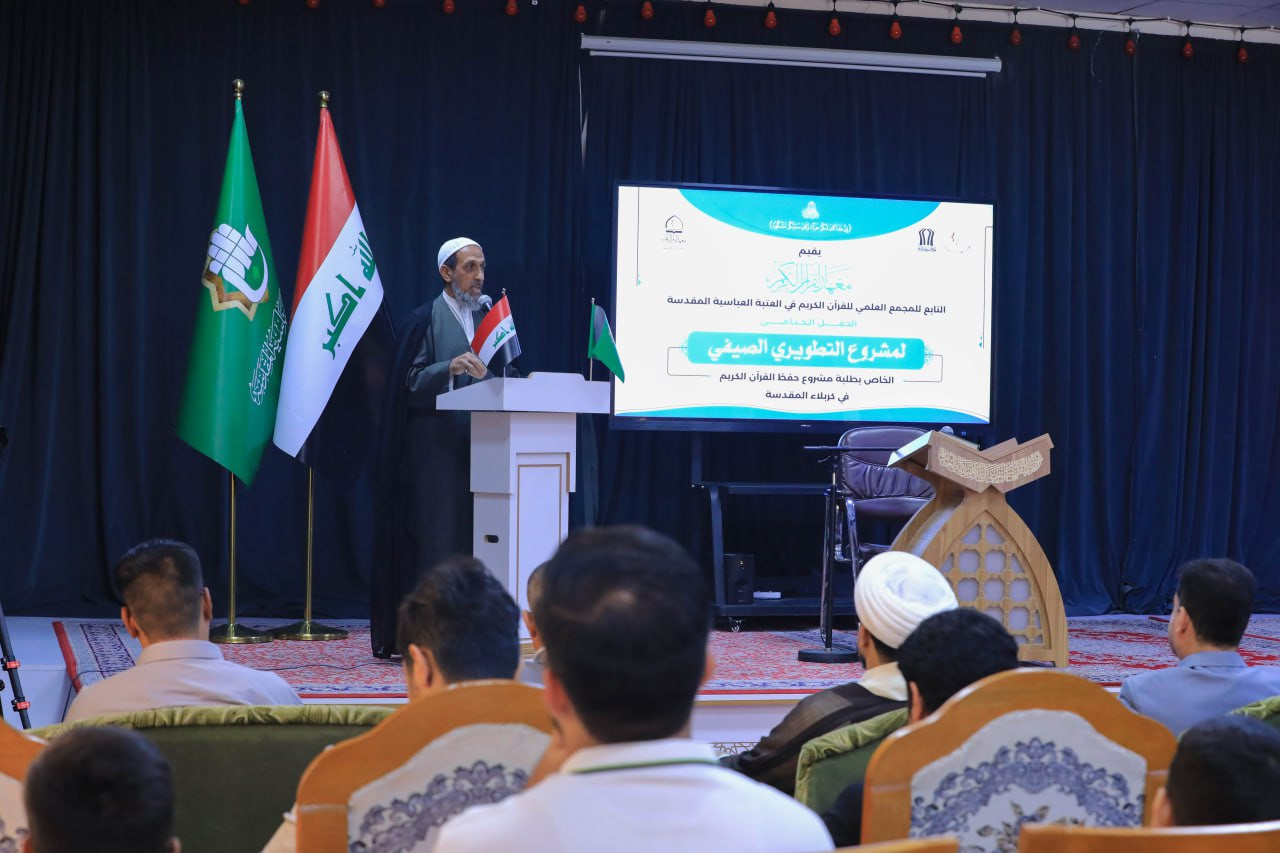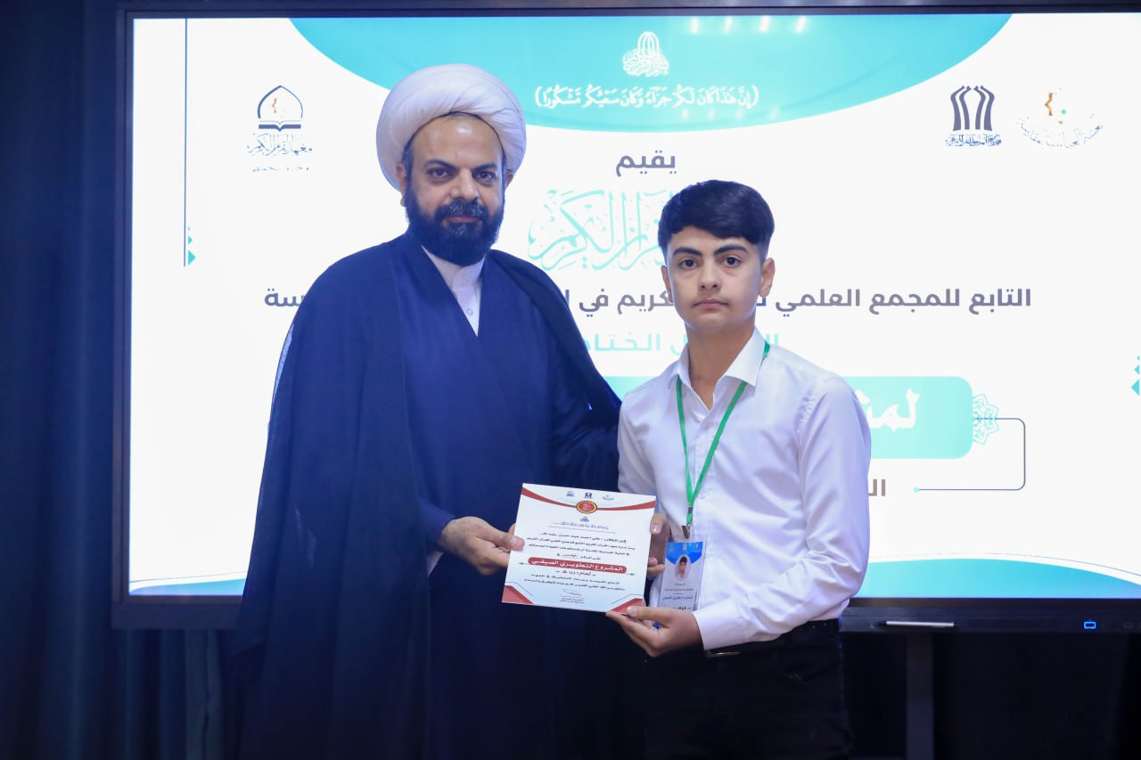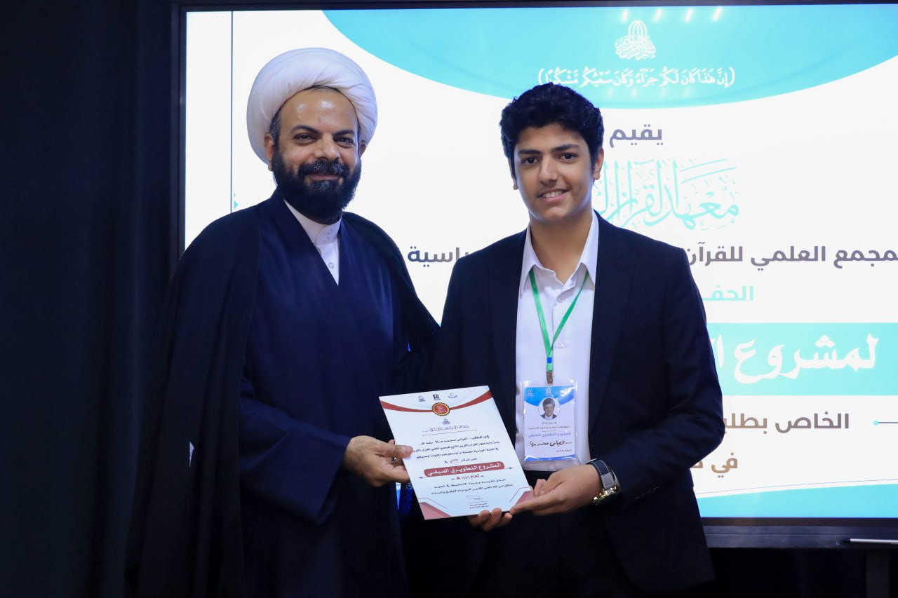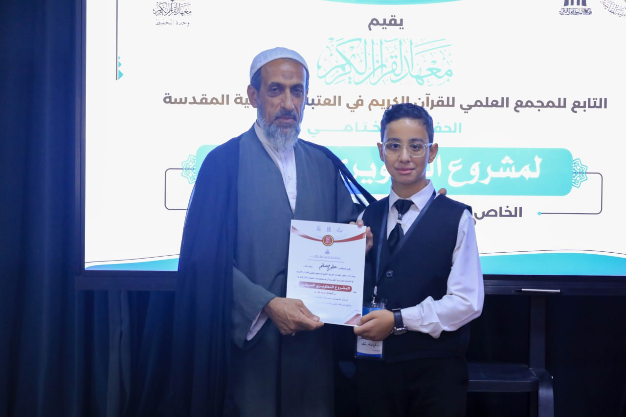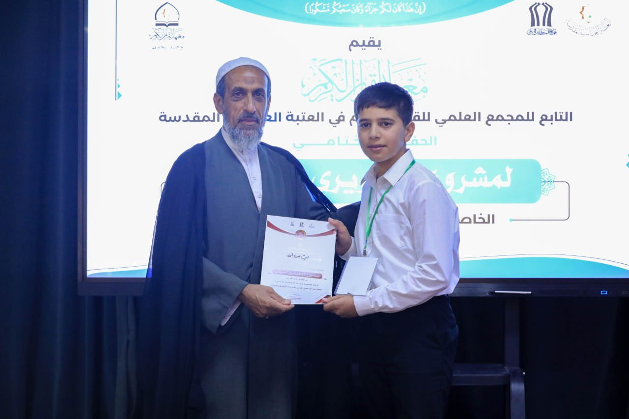 أحتفى المَجمَع العلميّ للقرآن الكريم التابع للعتبة العباسية المقدسة، بتخرج أكثر من (70) حافظًا من طلبة المشروع التطويري الصيفي الخاص بمشروع حفظ القرآن الكريم في كربلاء، الذي يشرف عليه معهد القرآن الكريم التابع للمَجمَع. الحفل افتتح بتلاوة للحافظ البرعم علي عادل، تلتها قراءة سورة الفاتحة على أروح الشهداء، ثم كلمة المَجمَع العلميّ ألقاها المعاون التعليمي لرئيس المَجمَع الدكتور علاء الموسوي التي رحب فيها بالحضور، وبارك للقائمين على المشروع جهودهم المبذولة، مؤكدًا أن العتبة العباسية المقدسة دأبت على تكثيف الجهود في الجانب القرآني، والاهتمام بالمشاريع الخاصة ببناء الإنسان واهم هذه المشاريع هي المشاريع القرآنية. تلتها كلمة المعهد ألقاها ممثلًا عنه مسؤول وحدة التلاوة الشيخ علي الرويعي، التي بين فيها أبعاد وأهداف المشروع الذي انطلاق قبل ثلاثة أشهر أستثمارًا لأوقات العطلة الصيفية، والمتضمن ثلاث محاور الأول لتثبيت المحفوظات، وحفظ 50 صفحة من المصحف الكريم، والمحور الثالث هو التربوي، وقدمت هذه المحاور في عشرة ساعات يوميًا، كما شكر كل من ساهم في إنجاح المشروع الذي يهدف إلى بناء شخصية الطالب. جاء بعدها فقرة المطاردة في الحفظ قدمها نخبة من طلبة المشروع استعرضوا فيها مهارات ما يحفظون، تلاها عرض مسرحي لطلبة المشروع بين كيف تنقل المفاهيم القرآنية بكل بساطة من خلال ما تلقوها الطلبة طيلة أيام المشروع، أعقبها تلاوة جماعية لمجموعة من طلبة وحدة التحفيظ، ثم اختتم الحفل بتوزيع الشهادات التقديرية على الأساتذة والمشاركين.