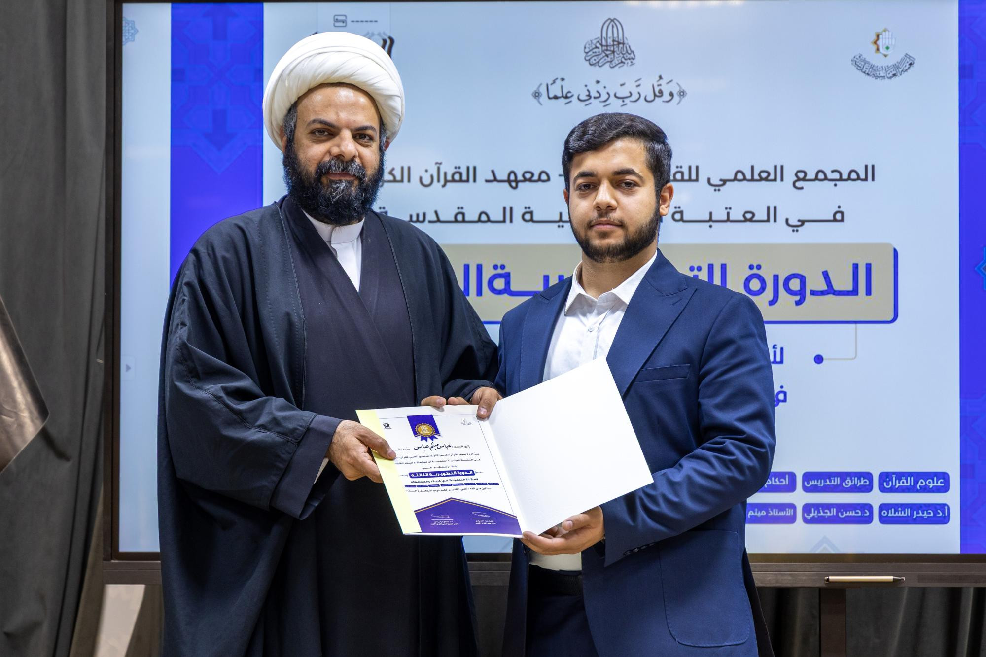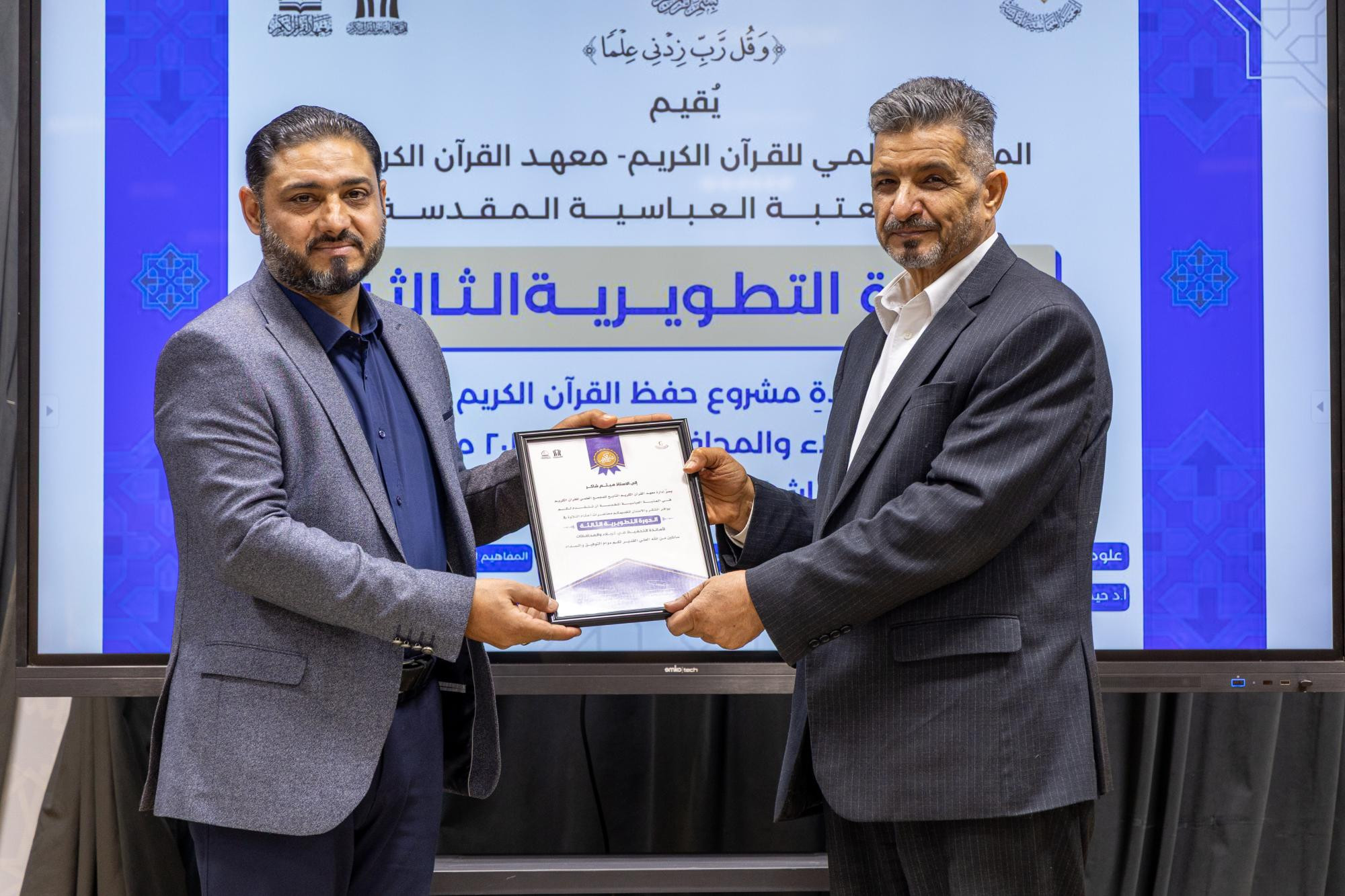 اختتم المجمع العلمي للقرآن الكريم في العتبة العباسية المقدسة الدورة التطويرية الثالثة لأساتذة مشروع حفظ كتاب الله في محافظة كربلاء. وقال مدير معهد القرآن الكريم في كربلاء التابع للمجمع، الشيخ جواد النصراوي: إنّ "المعهد اختتم الدورة التطويرية الثالثة الخاصة بأساتذة مشروع حفظ القرآن الكريم، التي أشرف على التدريس فيها نخبة من الأساتذة الأكاديميين، إذ قدموا محاضرات في علوم القرآن، وطرائق التدريس، وأحكام التلاوة، وأساليب التحفيظ، ولوائح التحكيم، وعلم النفس، والمفاهيم القرآنية، ومحاضرات علمية وتربوية". وأضاف، أنّ "الدورة أُقيمت في مقر المعهد بكربلاء استمرت ثمانية أيام، بواقع يومين في الأسبوع، وشارك فيها أكثر من 55 أستاذًا من أساتذة مشروع حفظ القرآن الكريم الموزعين في كربلاء والمحافظات". وبيّن النصراوي، أنّ "المعهد يهدف من إقامة هذه الدورة إلى تطوير مهارات الأساتذة، وزيادة معارفهم، وتعزيز قدرتهم على إدارة حلقات مشروع الحفظ، وضمان ديمومة العمل القرآني واستمراره بأفضل صورة". وأوضح، أنّ "حفل الختام شهد فقرات متنوعة، منها تلاوة افتتاحية للحافظ حسين القزويني، وكلمة للمعهد ألقاها مسؤول وحدة التحفيظ فيه الشيخ علي الرويعي، استعرض فيها تفاصيل الدورة وأهدافها، وأهمية استمرار تطوير المهارات لدى أساتذة التحفيظ، تلتها تلاوة جماعية قدمها مجموعة من طلبة مشروع حفظ القرآن الكريم في كربلاء، واختُتم الحفل بتوزيع الشهادات التقديرية والهدايا على أساتذة الدورة وطلبتها".