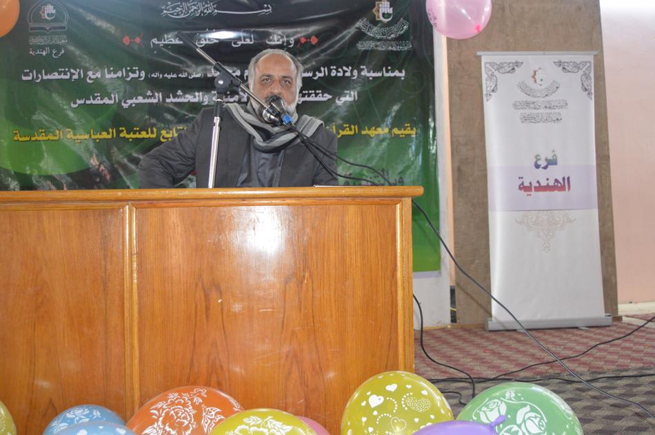 بالتزامن مع بذكرى ولادة سيد الكائنات نبي الرحمة محمد (صلى الله عليه وآله) وولادة صادق العترة الإمام جعفر بن محمد (عليه السلام) والإنتصارات التي حققتها قواتنا الأمنية وحشدنا المقدس أقام معهد القرآن الكريم – فرع الهندية - التابع للعتبة العباسية المقدسة محفلاً قرآنياً وشعرياً على قاعة منتدى شباب الهندية الحفل شهد حضور جمع من المؤمنين ومشاركة نخبة من القرّاء والشعراء في القضاء وهم كل من (الحاج الحافظ كريم الهنداوي، القارئ احمد الاعرجي، القارئ الاستاذ يوسف الفتلاوي، الملا زهير البرقعاوي، الشاعر علاء الزبيدي) كما شهد الحفل كلمة للسيد حامد المرعبي مسؤول الفرع بين فيها جملة من سجايا النبي الأكرم صلى الله عليه وآله وبعض سيرته العترة بإعتباره خاتم الأنبياء وسيد الروسل وفاتح طريق الهداية للإنسانية جمعاء كما تناول السيد المرعبي في كلمته البطولات الكبيرة التي سطرها أبطال العراق من فرسان القوات الأمنية والحشد الشعبي المقدس مبيناً أن النبي وأهل البيت (عليه وعليهم أفضل الصلاة والسلام) هم المصدر المحرك والدافع للصمود والاستبسال على حد تعبيره.