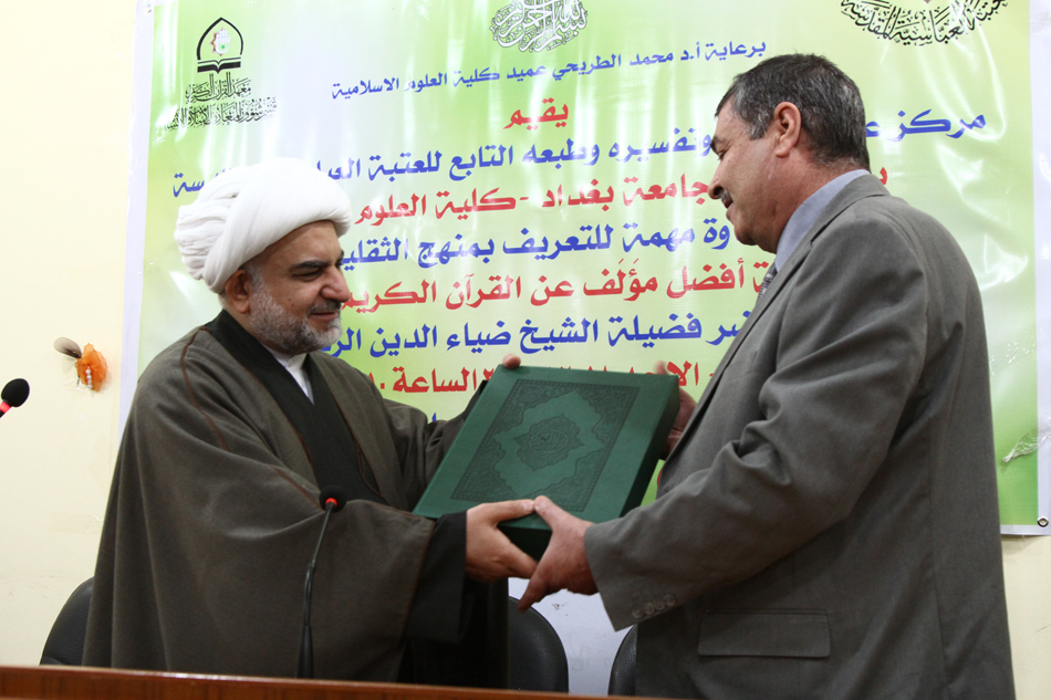 برعاية عميد كلية العلوم الإسلامية في جامعة بغداد الأستاذ الدكتور محمد الطريحي أقام مركز علوم القرآن وتفسيره وطبعه التابع لمعهد القرآن الكريم في قسم شؤون المعارف الإسلامية والإنسانية في العتبة العباسية المقدسة يوم أمس الأحد 18/12/2016م ندوة علمية تعريفية بمنهج الثقلين الشريفين وهو المنهج المعتمد في المسابقة القرآنية التي أطلقها المركز والموسومة بعنوان (مسابقة أفضل مؤلف عن القرآن الكريم على منهج الثقلين) حيث تناولت الندوة التي قدمها مدير مركز علوم القرآن وتفسيره وطبعه فضيلة الشيخ ضياء الدين الزبيدي عرض حديث الثقلين ومصادر وصوله إلينا ومتونه الصيحية المتواترة التي تفضي جميعها إلى إقتران القرآن الكريم وتلازمها مع العترة وتساويهما في الرتبة كما تطرق الشيخ الزبيدي إلى تاريخ القرآن الكريم ورواياته والقراءات وقرائها وعددها وجملة من المعلومات بخصوص الكتاب العزيز بإعتباره أحد الثقلين ثم عرف العترة والمراد منها في الحديث الشريف وطرق الأخذ ومصادر حديثهم صلوات الله وسلامه عليهم. الندوة شهدت عدد من المداخلات العلمية والأسئلة النقاشية حول محاورها المختلفة وموضوعها المهم - منهج الثقلين - بوصفه منهج هادي إلى الحق كما تناولت التعريف بمسابقة أفضل مؤلف عن القرآن الكريم على منهج الثقلين وشورط تلك المسابقة ومحاورها. عميد كلية العلوم الإسلامية في جامعة بغداد الأستاذ الدكتور محمد الطريحي بين لمركز الإعلام القرآني عن شكره الكبير للعتبة العباسية المقدسة على التواصل مع الجامعات العراقية مبيناً أن العتبة المقدسة كان لها يد الطول في إقامة مختلف النشاطات القرآنية وفي عدد من الجامعات بهدف خدمة القرآن الكريم ونشر تعاليم الإسلام الحنيف مضيفاً أننا نشعر بالفخر عندما نتعرف على منجزات العتبة المقدسة فالهدية القيمة التي حملها الوفد اليوم والمتمثلة بأول مصحف يطبع بجهود عراقية خالصة ابتداء بالخط والاعداد وحتى الطباعة وبانامل منتسبي العتبة العباسية المقدسة لشيء نفخر به جميعاً لافتاً إلى أن الندوة قدمت معلومات علمية مهمة بخصوص منهج الثقلين قد تغيب عن ذهن الكثيرين بإعتباره منهجاً بحثياً رصيناً.