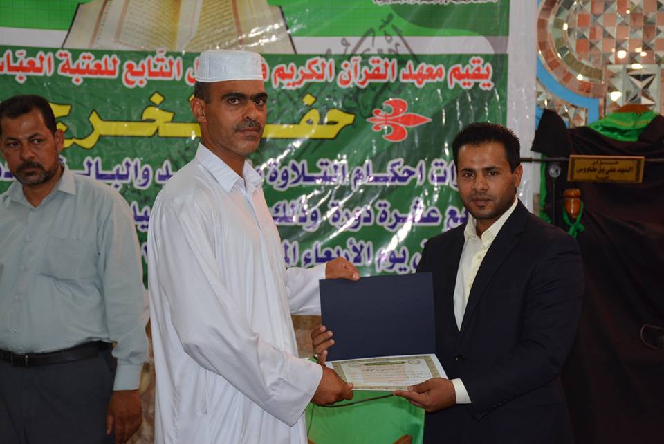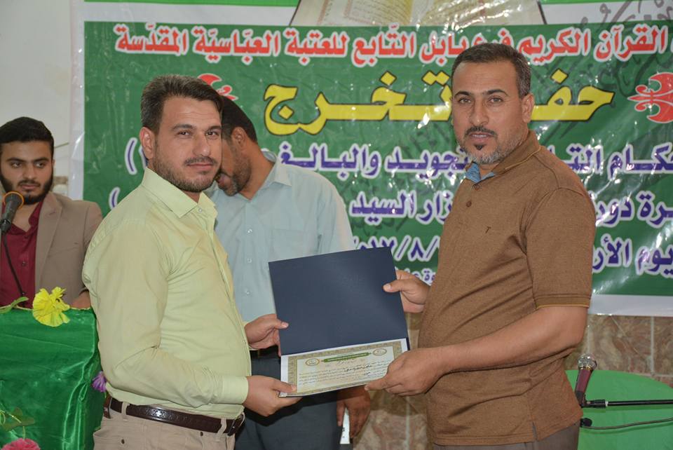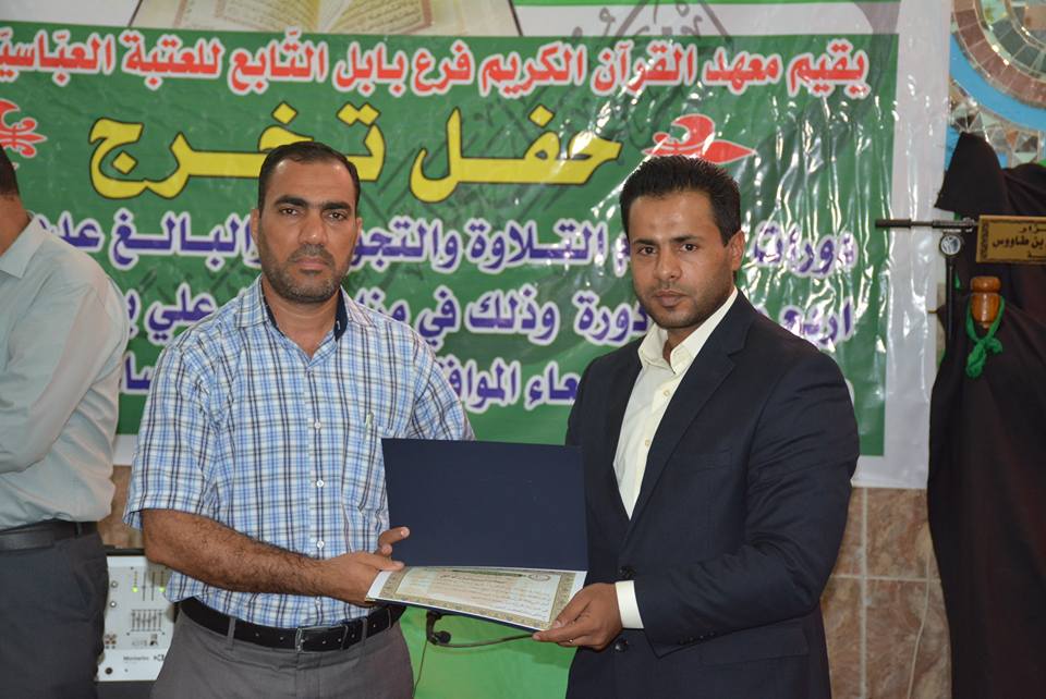 أقام معهد القرآن الكريم / فرع بابل التابع للعتبة العباسية المقدسة حفل تخرج لـ (14) دورة في احكام التلاوة والتجويد وكان عدد الطلبة المشاركين في الدورة اكثر من (200) طالب حيث احتضن هذا الحفل المبارك المزار الشريف للسيد علي بن طاووس (قدس سره) وافتتح الحفل بتلاوتين عطرتين ومن بعدها جائت كلمة معهد القرآن الكريم التي القاها مسؤول وحدة التلاوة الاستاذ (لؤي الوطيفي) وتلتها وقفة شعرية في مدح الرسول الاكرم (صلى الله عليه واله) واهل بيته الطيبين الطاهرين(عليهم السلام) وفي ختام الحفل تم توزيع شهادات تقديرية للأساتذة وشهادات تخرج للطلبة وذلك تثميناً لجهودهم المبذولة في الدورة . يذكر أن معهد القرآن الكريم يقيم العديد من الدورات والمسابقات والمحافل القرآنية البهيجة في الكثير من المناسبات المختلفة بغية نشر الوعي القرآني بين أوساط المجتمع.