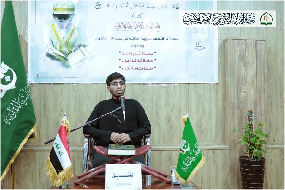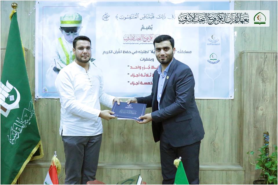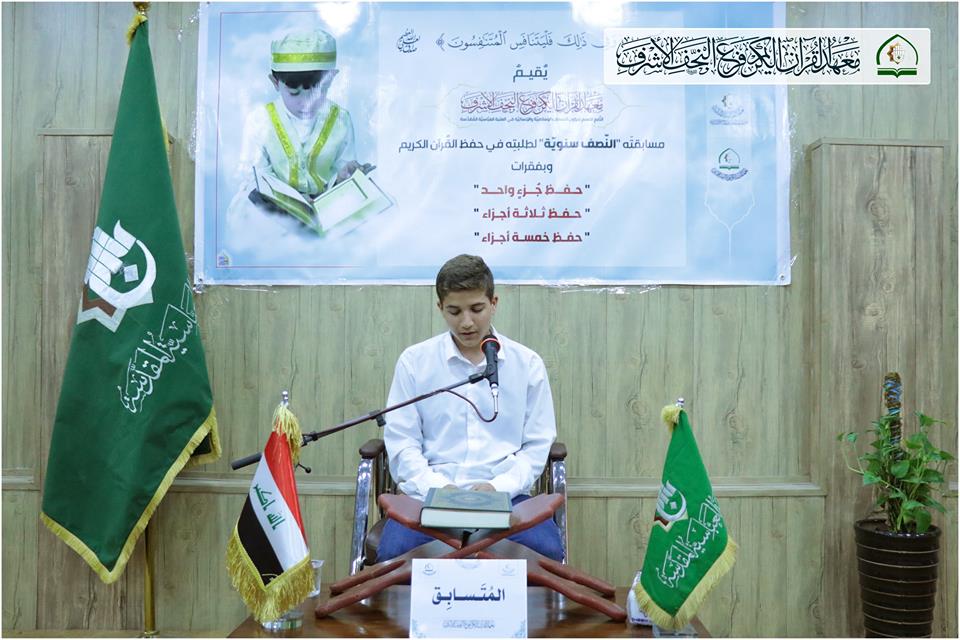 أقام معهد القرآن الكريم / فرع النّجف الأشرف فعاليات المرحلة النّهائيّة للمُسابقة نصف السنوية التي يقيمُها لِطَلَبَتِهِ في حفظ القُرآن الكريم. وجَرَتِ المنافسةُ بين الطّلبة المُتَأَهِّلينَ في: - حفظ جُزء واحد من القرآن الكريم. - حفظ ثلاثة أجزاء من القرآن الكريم. - حفظ خمسة أجزاء من القُرآن الكريم. . وفي نهاية المسابقة وبعد إتمام جمع الدّرجات تمّ تكريم الثّلاثة الأوائل لكلّ فقرة؛ وسط أجواء مُباركة مليئة بذكر القُرآن الكريم والصّلوات على رسول الله وآله الأطهار (عليهم السّلامُ). يذكر أن معهد القرآن الكريم التابع للعتبة العباسية المقدسة يقيم العديد من الدورات والمسابقات والمحافل القرآنية في المناسبات المختلفة بغية نشر الوعي القرآني في ارجاء العالم الإسلامي.