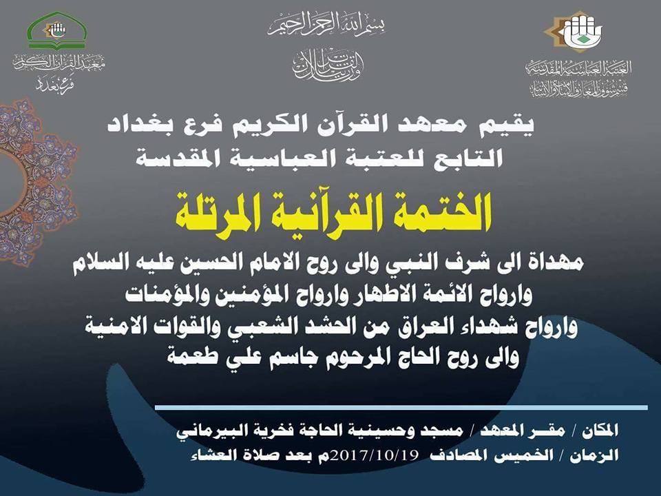 معهد القرآن الكريم فرع بغداد يواصل إقامته للختمات القرآنية المرتلة في الحسينيات والمساجد وبيوت المؤمنين يهدى ثوابها إلى النبي الأكرم صلى الله عليه وآله وأهل بيته الطاهرين عليهم السلام وأرواح الشهداء ويأتي هذا المشروع المبارك بهدف تجذير الثقافة القرآنية ونشر عبق الكتاب العزيز بين أوساط المجتمع عامة بغية الوصول للحياة السعيدة التي يحكمها نور الثقلين الشريفين. الختمات وزعت على مختلف مناطق العاصمة الحبيبة بغداد وآخرها أقيم مساء أمس الخميس المصادف 19/10/2017/ في مسجد الحاجة فخرية البيرماني الكائن بمنطقة الشعب وشارك فيه مجموعة من قرّاء المعهد وحضره جمع من المؤمنين الذين جذبهم الشوق الدائم للتزود بالعبر القرآنية وتحصيل عظيم الحسنات. يذكر أن معهد القرآن الكريم فرع بغداد يقيم العديد من المحافل القرآنية مضافاً إلى الدورات والجلسات التعليمة وحلقات لحفظ الكتاب العزيز وغيرها الكثير وان هذه البرامج تقام بإشراف أساتذة مختصين الأمر الذي يجعل منها ذات أهمية كبيرة لمن أراد تعلم القرآن الكريم وتعليمه مستقبلاً.