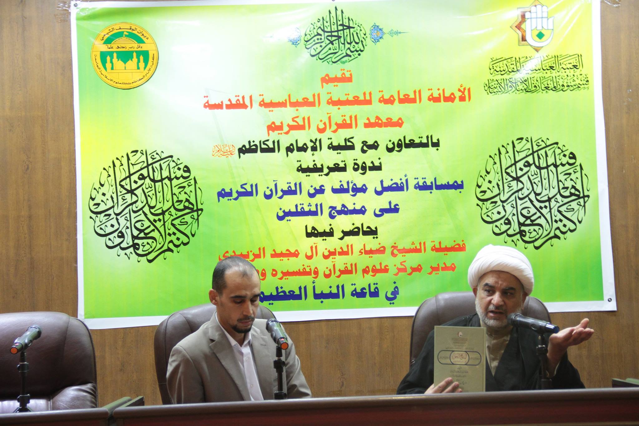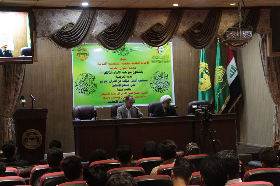 أقام مركز علوم القرآن وتفسيره وطبعه في معهد القرآن الكريم التابع للعتبة العباسية المقدسة وبالتعاون مع كلية الإمام الكاظم (عليه السلام) في العاصمة بغداد ندوة تعريفية بمسابقة أفضل مؤلف عن القرآن الكريم على منهج الثقلين حيث حاضر فيها فضيلة الشيخ (ضياء الدين آل مجيد الزبيدي) مدير المركز في العتبة المقدسة حيث جمعت الندوة عدداً من الأساتذة وطلبة الدراسات العليا و الأكاديميين حيث ألقى فضيلته محاضرة مفعمة بالمعلومات القيمة تناولت التعريف بالمنهج الحق وأهميته البالغة للمكلفين وابرز مميزاته كما تمت الإشارة إلى إن معهد القران الكريم اصدر مؤخرا كتاباً تحت هذا العنوان والذي كان مطلباً ملحاً للكثير من المؤمنين لكي يكون لهم دليلاً يستفيدون منه في معرفة طريق النجاة من الضلال ويكون لهم مشعلا هاديا على طريق الثقلين وقد تمحورت الندوة في صلب هذا الموضوع الشيق ومن ثم عرف فضيلته عن المسابقة التي يقيمها المركز لأفضل مؤلف عن القرآن الكريم والعترة الطاهرة وكيفية الكتابة في المحاور التي تم تحديدها في المسابقة وبين ان هناك عدة جوائز إلى الفائزين من المؤلفين ،ثم أجاب سماحته على المداخلات المهمة من الأساتذة والطلبة والحضور كما بيّن سماحة السيد الدكتور (نعمة جابر آل نور) أستاذ اللغة العربية والتفسير والمنطق والإعجاز القرآني والعقائد في قسم علوم القرآن والحديث في كلية الإمام الكاظم (عليه السلام) قائلاً: إن هذه الندوة حول المنهج الحق اعتبرها من أهم الندوات التي تحتضنها الكلية بخصوص السير على هدي الثقلين قرآناً وعترةً في هذا المجال الحيوي الذي يتضمن العقائد والإحكام والقيم فلولا وجود العترة إلى جانب القرآن الكريم لما فهمنا الإعجاز القرآني وماذا يريد الله جلا وعلا لان كتاب الله يحتاج إلى بيان المراد منه فبذلك نشيد بما قدمه معهد القرآن الكريم وبالخصوص مركز علوم القرآن وتفسيره وطبعه بإصداره الأخير(المنهج الحق كتاب الله والعترة الطاهرة) هذا الكتاب الذي يزج في عقول شبابنا عدم امكانية الفصل بين الكتاب و العترة ويقدم بحوثاً قيمة تجد فيها الكثير من الدلائل في كنف هذا الكتاب، وأما بالنسبة لمسابقة أفضل مؤلف فهذا الشيء يشكل نوعا من الإبداع في مجال المنظومة المعرفية في الإسلام فالأمة محتاج إلى إن تطلع على خصوصيات الثقلين وتنتبه إلى موارد الاشتباه في الإتباع فمن يكتب في هذا المجال يؤدي الحق إلى أهل البيت (عليهم السلام). ومن جانبه قدم سماحته الشكر والامتنان إلى العتبة العباسية المقدسة وعلى رأسهم سماحة المتولي الشرعي السيد احمد الصافي (دام عزه) وإلى معهد القرآن الكريم وبالخصوص مركز علوم القرآن والى كل العاملين في العتبة المطهرة على ما يقدموه من خدمة إلى الكتاب المجيد والعترة الطاهرة من ندوات وبحوث وإصدارات من اجل إعلاء كلمة الحق وتكريس علوم القرآن عند الجميع ونتمنى لهم المزيد من النجاح والاستمرار في خدمة الكتاب والعترة. ومن الجدير بالذكر إن مركز علوم القرآن وتفسيره وطبعه في معهد القران الكريم التابع لقسم شؤون المعارف الاسلامية والإنسانية في العتبة العباسية المقدسة يُقيم العديد من الدورات والندوات والبحوث العلمية والقرآنية بالإضافة إلى الإصدارات التي يصدرها المركز بغية نشر الوعي القرآني والهدي على المنهج الحق كتاب الله والعترة الطاهرة بين أواسط المجتمع.