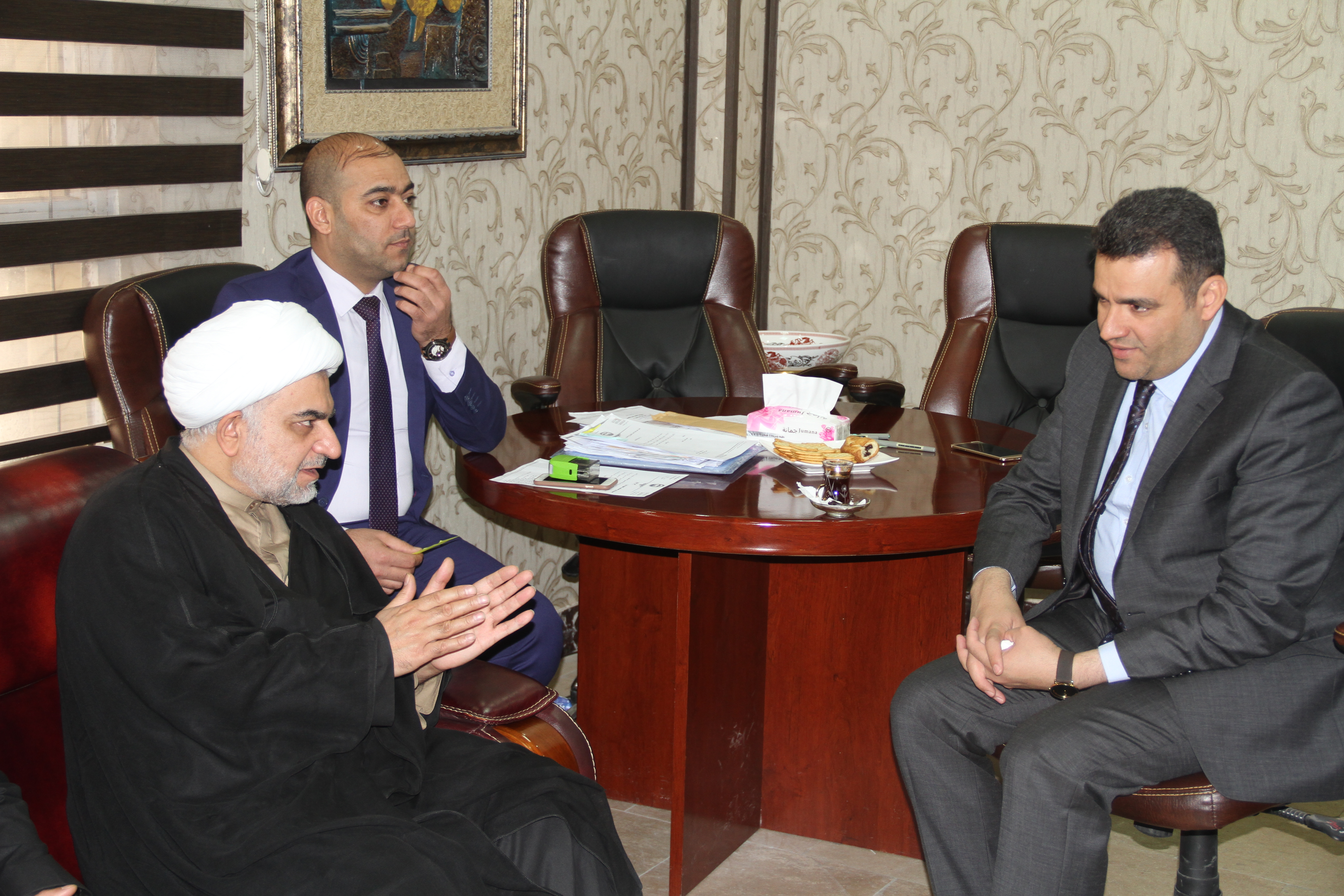 أستقبل عميد كلية الإمام الكاظم (عليه السلام) للعلوم الإسلامية التابعة لديوان الوقف الشيعي الدكتور غني الخاقاني، مدير مركز علوم القرآن وتفسيره وطبعه في العتبة العباسية المقدسة فضيلة الشيخ (ضياء الدين آل مجيد الزبيدي) ممثلا عن معهد القرآن الكريم حيث أعرب د.الخاقاني عن شكرهُ وامتنانه لما يقدمه المعهد من نتاجات مهمة في خدمة القرآن الكريم والعترة الطاهرة من بحوث وندوات ودورات قرآنية فضلاً عن الإصدارات التي يصدرها مركز علوم القرآن وتفسيره وطبعه. ومن جانبه أكد الخاقاني أهمية فتح مجال التعاون مع معهد القرآن الكريم والعتبة العباسية المقدسة على أقامت العديد من الدورات والندوات المثمرة ومن خلال تعاون مشترك ستقام ندوة قرآنية علمية لـ طلبة الدراسات العليا في الكلية. كما قدم شكره إلى الأمانة العامة للعتبة العباسية المقدسة وخصوصاً سماحة المتولي الشرعي السيد احمد الصافي (دام عزه) وإلى معهد القرآن الكريم ومركز علوم القرآن فيه على ما يقدموه من نتاج علمي مثمر تبتهج له العقول والقلوب.
