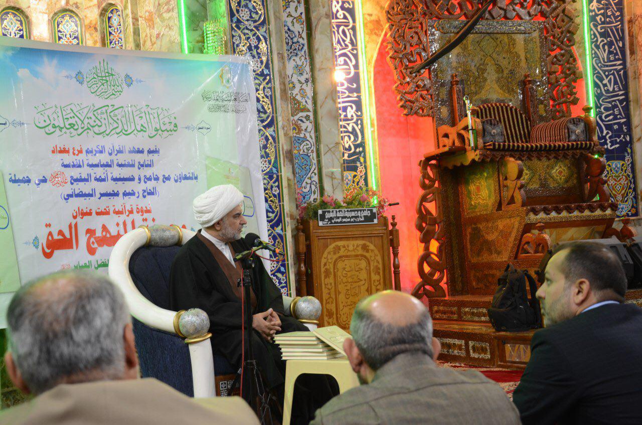 أقام معهد القران الكريم / فرع بغداد التابع للعتبة العباسية المقدسة ندوة قرآنية تحت عنوان (المنهج الحق كتاب الله والعترة الطاهرة) والتي احتضنتها جامع وحسينية أئمة البقيع (عليهم السلام) في العاصمة بغداد ـ حي جميلة وذلك يوم الجمعة المصادف ١ كانون الاول ٢٠١٧ حيث حضر الندوة جمع من الاساتذة والباحثين والمهتمين بالشأن القرآني وقد حاضر فيها فضيلة الشيخ (ضياء الدين ال مجيد الزبيدي) مدير مركز علوم القرآن وتفسيره وطبعه في العتبة العباسية المقدسة وقد تناولت الندوة التعريف بالمنهج الحق وأهميته البالغة للمكلفين وابرز مميزاته كما تمت الإشارة الى ان معهد القران الكريم اصدر مؤخرا كتابا تحت هذا العنوان والذي كان مطلبا ملحا للكثير من المؤمنين لكي يكون لهم دليلا يستفيدون منه في معرفة طريق النجاة من الضلال وتميزت الندوة بالمداخلات الكثيرة عبر أصحابها عن الامتنان للعتبة العباسية المقدسة لإقامة هذه الندوات النافعة كما طالبوا بالمزيد منها مع إقامة دورات تطويرية لمعرفة المنهج الحق. من الجدير بالذكر ان مركز علوم القرآن وتفسيره وطبعه التابع لمعهد القرآن الكريم في العتبة العباسية المقدسة يقيم العشرات من الندوات والدورات والمحاضرات القرآنية والتي تحت عنوان المؤلف الذي اصدره مؤخراً (المنهج الحق كتاب الله والعترة الطاهرة) وهذا العنوان أصبح سلسلة من المحاضرات القيمة.