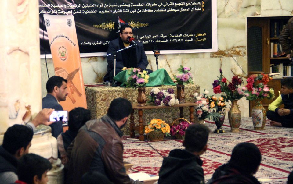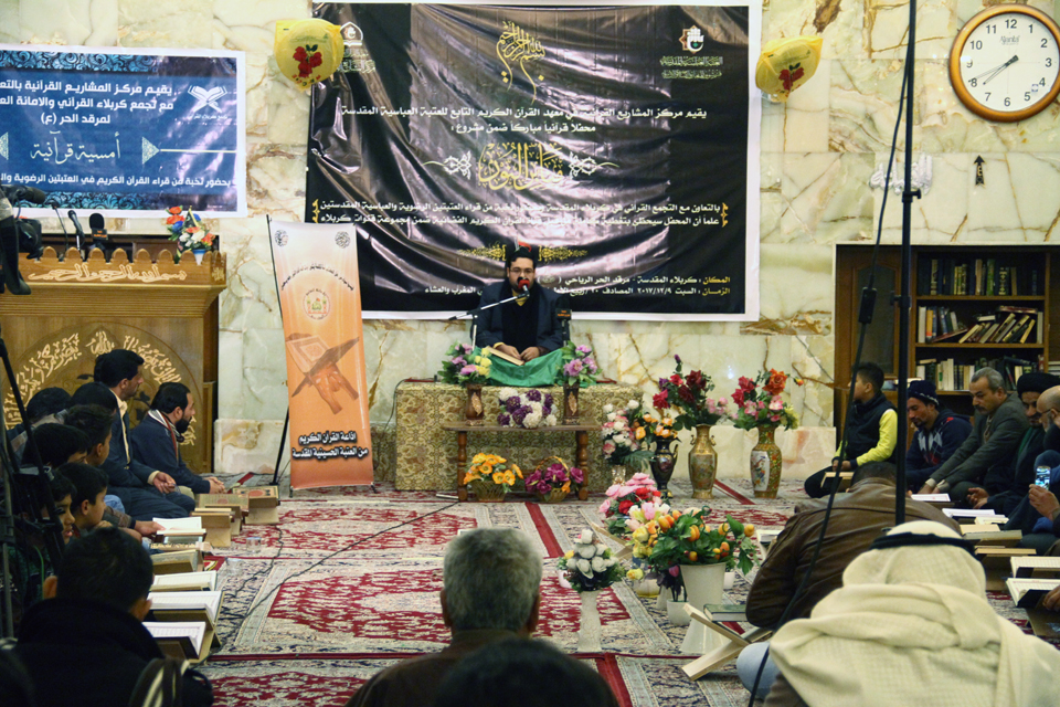 المحفل أقيم بالتعاون مع التجمع القرآني في كربلاء المقدسة مساء أمس السبت في مزار الشهيد الحر بن يزيد الرياحي في كربلاء المقدسة بمشاركة نخبة من قرّاء العتبتين المقدستين الرضوية والعباسية وحضره جمع من المؤمنين القاصدين لمجالس الذكر ومجموعة من زوار المرقد الطاهر.