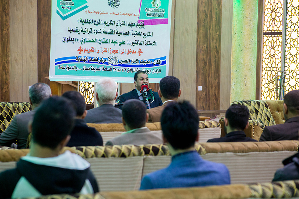 أقام معهد القرآن الكريم/ فرع الهندية التابع للعتبة العباسية المقدسة ندوة قُرآنيّة تحت عنوان (مدخل إلى إعجاز القرآن الكريم) يوم السبت الموافق 3/2/2018م، في مضيف الإمام الحسين (عليه السلام) في قضاء الهندية، حاضر فيها الأستاذ الدكتور (علي عبد الفتاح الحسناوي) حيث كانت الندوة مفعمة بالمعلومات القيمة من التعريف بالقرآن الكريم وأهميته البالغة وأبرز مميزاته لكي يكون للمؤمنين دليلاً يستفيدون منه في معرفة طريق النجاة من الضلال ويكون لهم مشعلا هاديًا على طريق الثقلين وقد تمحورت الندوة في صلب هذا الموضوع الشيق، وكانت هناك مداخلات قيمة وأسئلة من الحضور أجاب الدكتور الحسناوي عليها جميعا. يذكر أن معهد القرآن الكريم يُقيم العديد من الندوات والدورات القرآنية والعلمية من أجل نشر الثقافة القرآنية بين أوساط المجتمع فضلا عن المشاريع القرآنية الرائدة التي رفد بها الساحة.