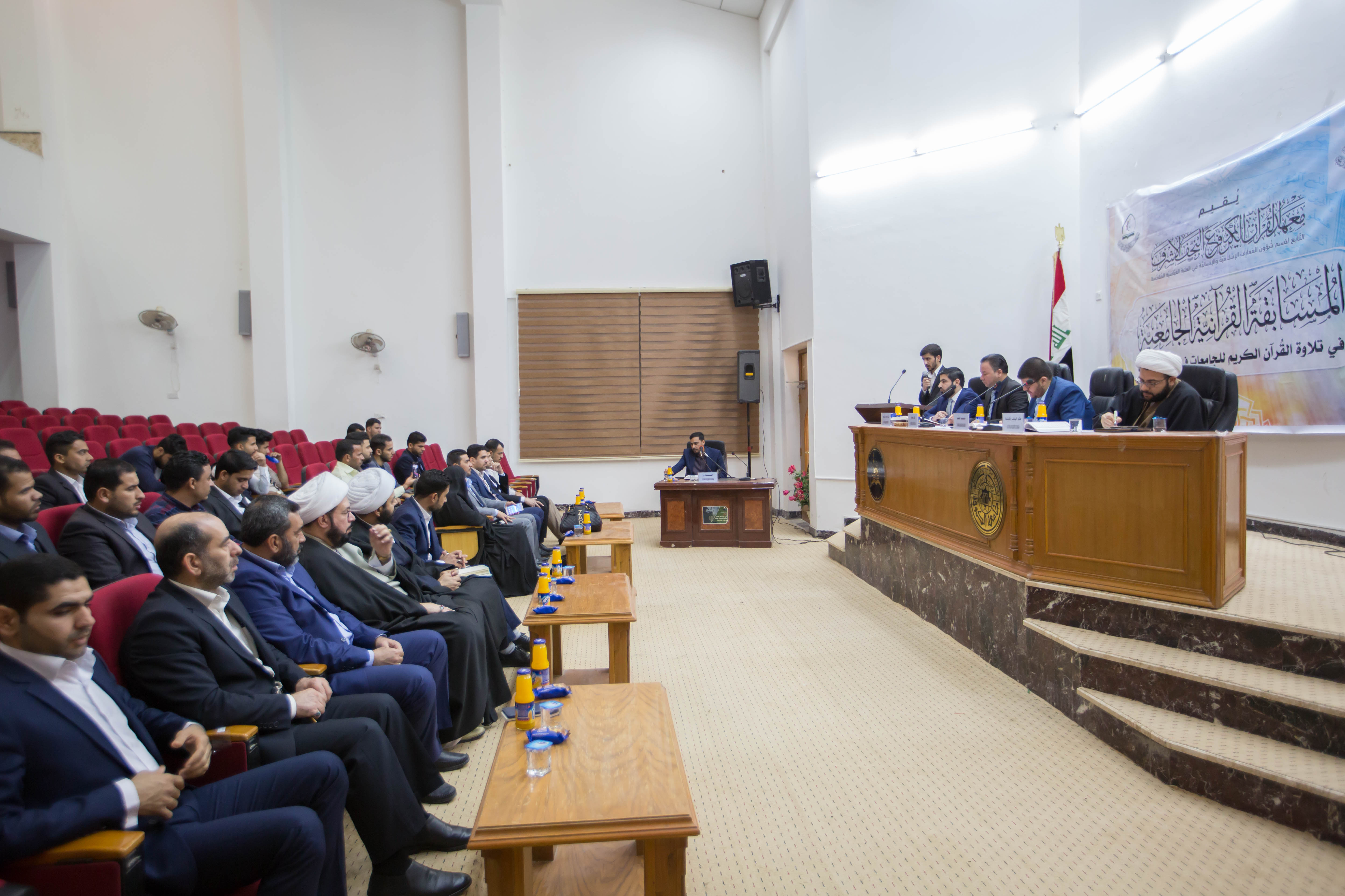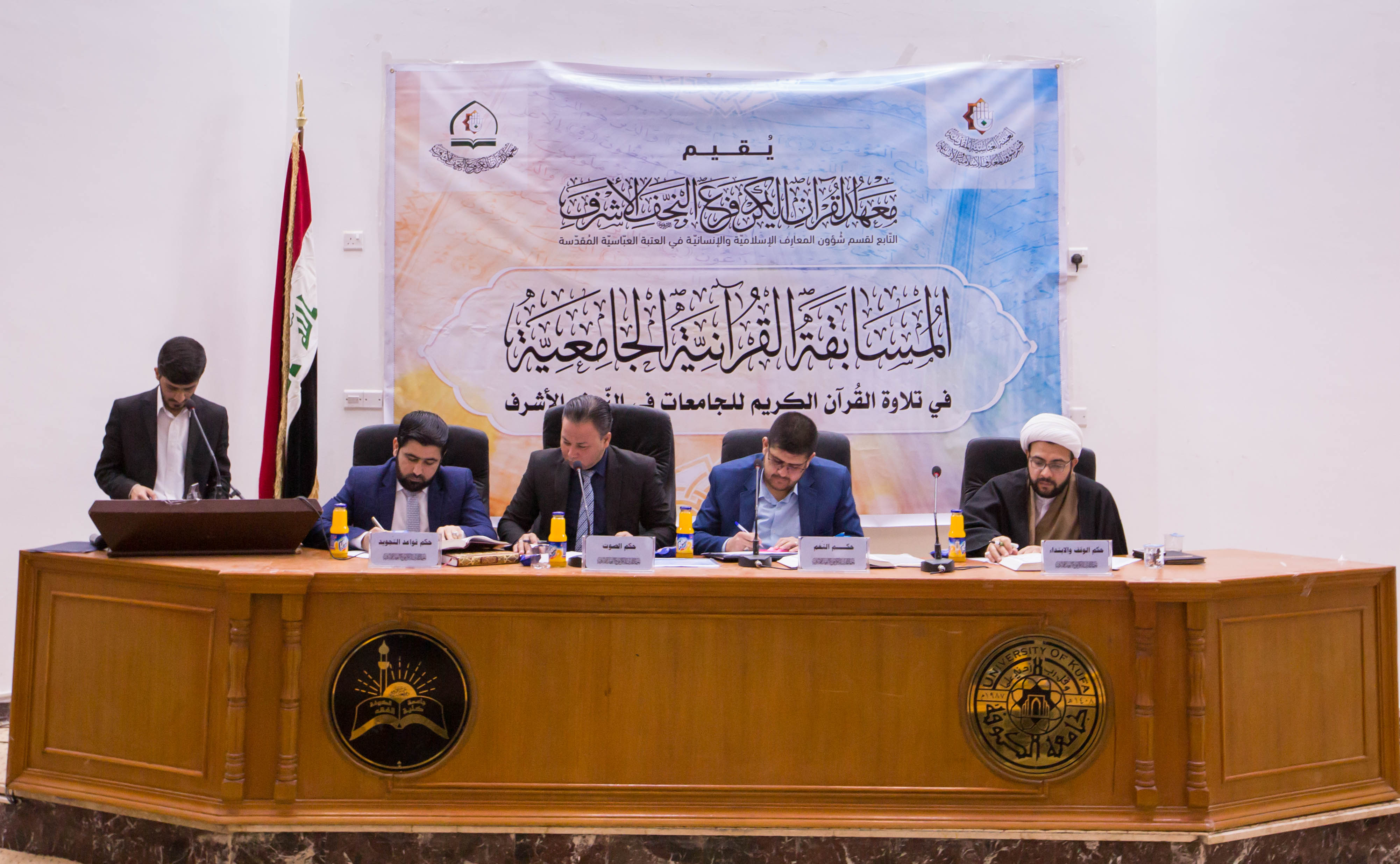 احتضنت جامعة الكوفة الحفل الختامي للمسابقة القرآنية الجامعية في التلاوة التي يقيمها معهد القرآن الكريم/ فرع النجف الأشرف التابع لقسم شؤون المعارف الإسلامية والإنسانية في العتبة العباسية المقدسة على قاعة كُلّيّة الفقه- جامعة الكوفة وسط حضور متنوّع مِن أساتذة وطلبة جامعيّين، وشخصيّاتٍ دينيّة ومُثقّفة، وبحضور وفدٍ من العتبة العباسية المقدسة. تخلل الحفل تلاوات للمتسابقين فيما تلتها كلمة العتبة العباسية المقدسة ألقاها رئيس قسم شؤون المعارف الإسلامية والانسانية الشيخ عمار الهلالي التي استعرض من خلالها مشاريع العتبة المقدسة الدينية منها والاقتصادية والفكرية واعقبها بمشاريع معهد القرآن الكريم التي وصفها بالرائدة والمميزة من نوعها على الساحة القرآنية خدمةً لكتاب الله والعترة الطاهرة، فيما شكر الهلالي رئاسة جامعة الكوفة وعمادة كلية الفقه على احتضانهم هذه المسابقة وتشجيعهم الطلبة على مثل هكذا مسابقات قرآنية وجعل الكتاب العزيز نصب أعينهم. جاء بعدها كلمة رئاسة جامعة الكوفة ألقاها الدكتور محسن العبادي معاون رئيس الجامعة للشؤون العلمية التي رحب من خلالها بالعتبة العباسية المقدسة وأثنى على ما تقدمه من مشاريع ثقافية وفكرية واقتصادية ودينية بين اواسط المجتمع واكد العبادي: لولا دعم العتبة العباسية المقدسة ووقوفها معنا لما كان لجامعتنا هذا النجاح الباهر. بعد ذلك أُعلنت اسماء الفائزين الثلاثة بالمسابقة من أصل 20 مشاركا وهم كل من: 1. (المركز الأوّل): عليّ حُسين العكراويّ -الكُلّيّة الإسلاميّة الجامعة. 2. (المركز الثّاني): حيدر يحيى الحجّار -الكُلّيّة الإسلاميّة الجامعة. 3. (المركز الثّالث): مُحمّد سعيد -كُلّيّة التّربية الأساسيّة -جامعة الكوفة. وفي ختام الحفل تم توزيع الدروع على الفائزين بالمسابقة وكل من ساهم في انجاح هذا الكرنفال المبارك.