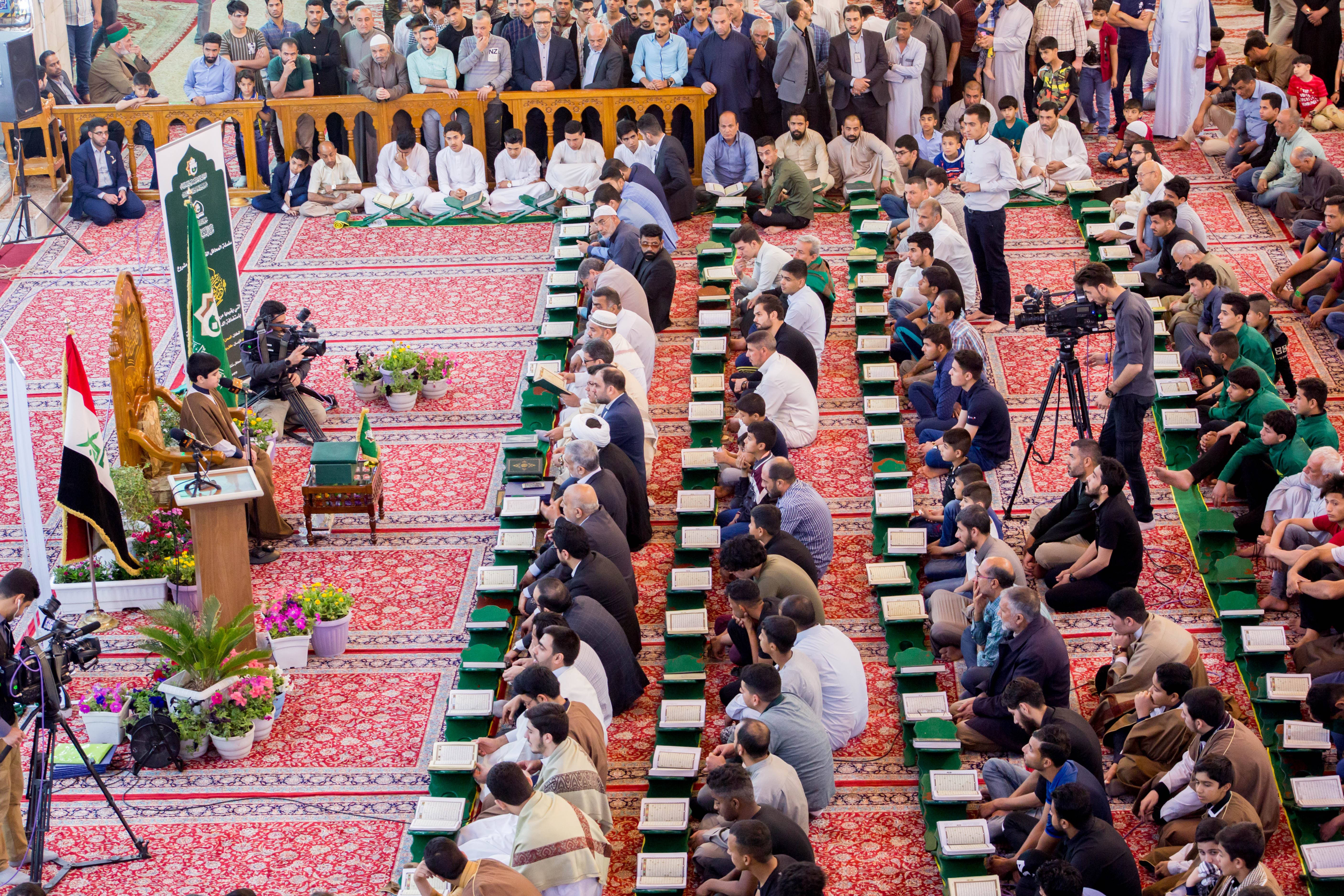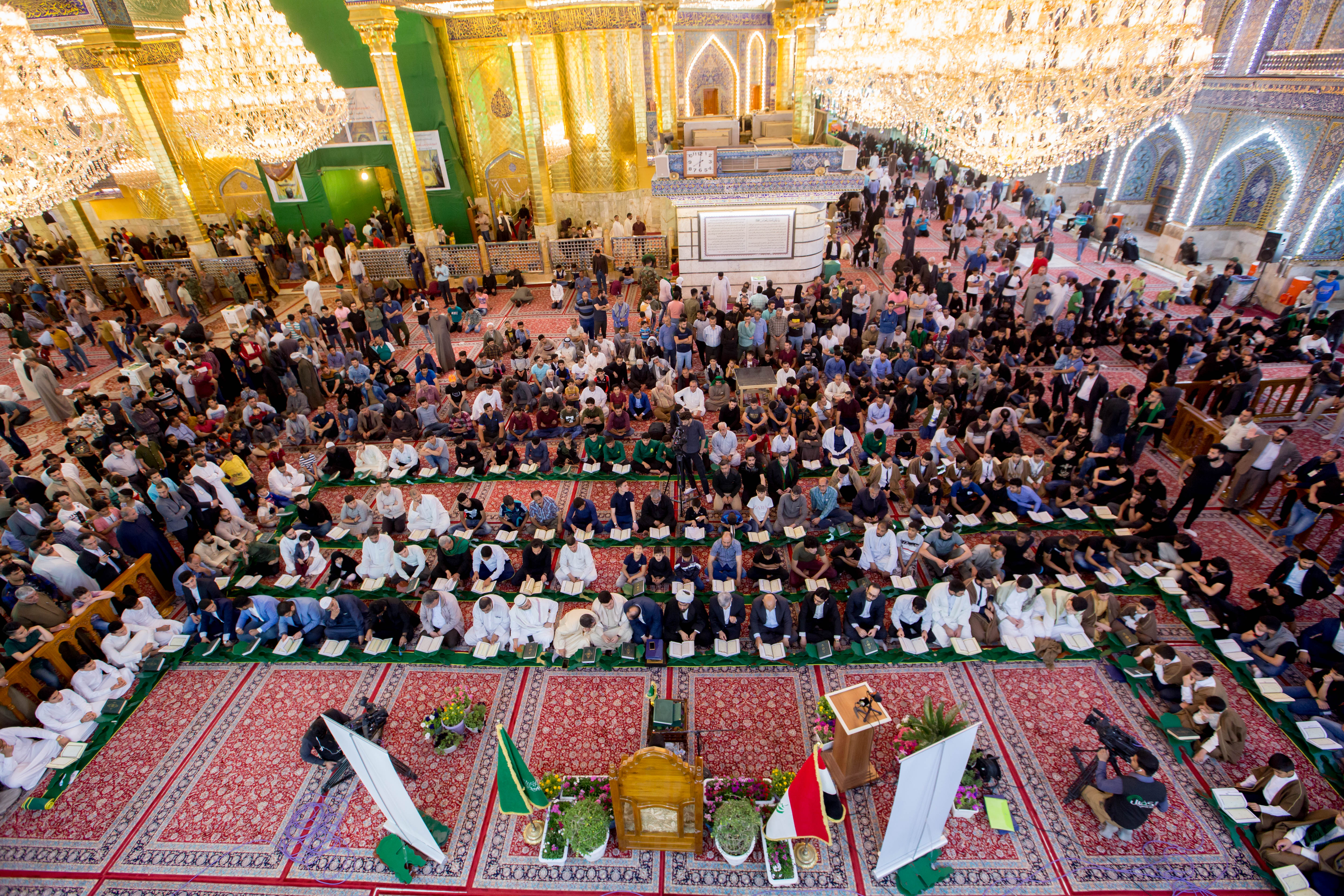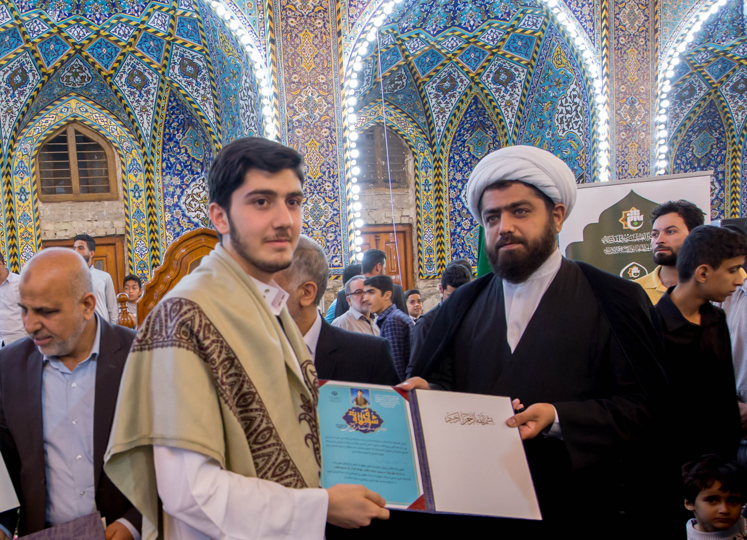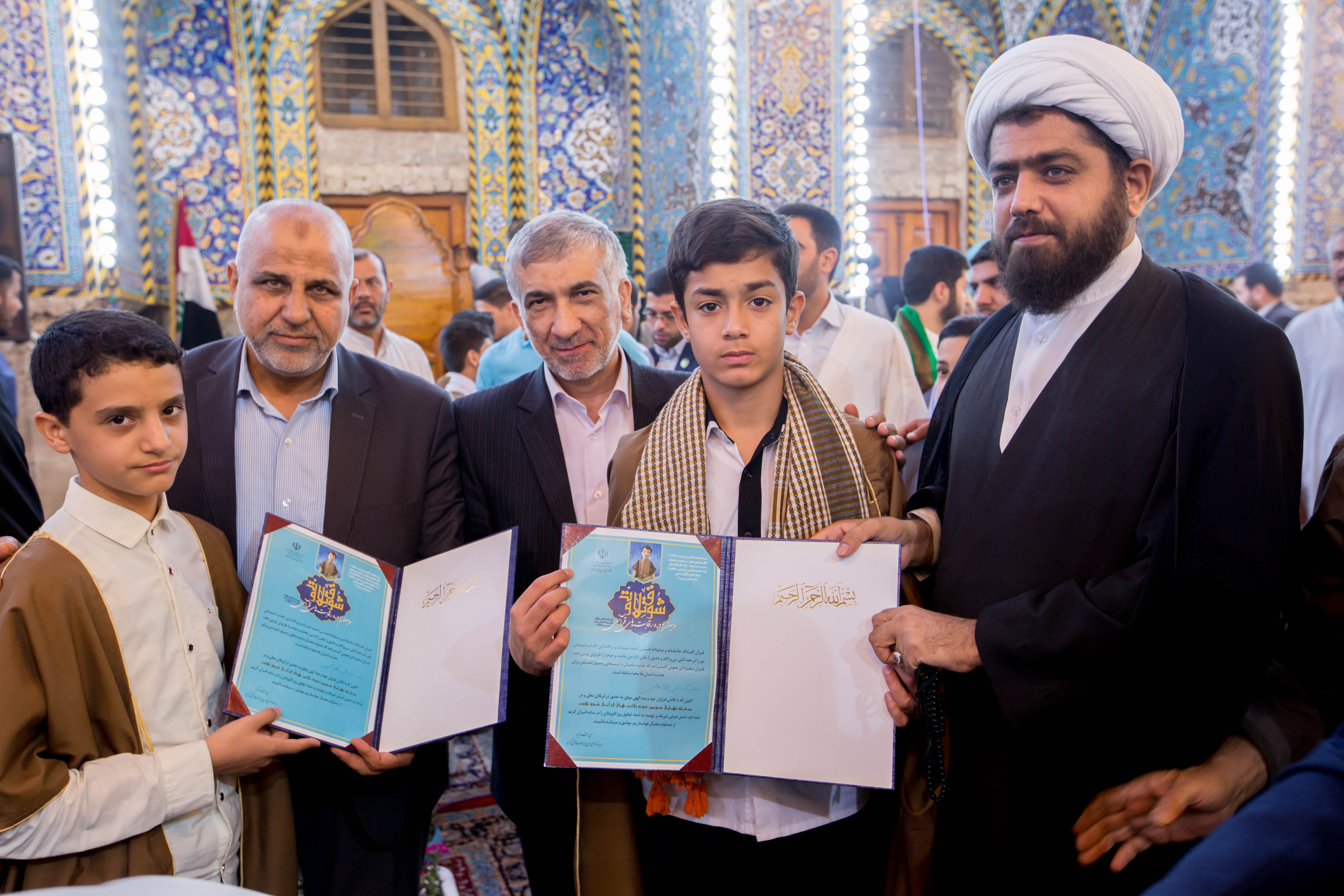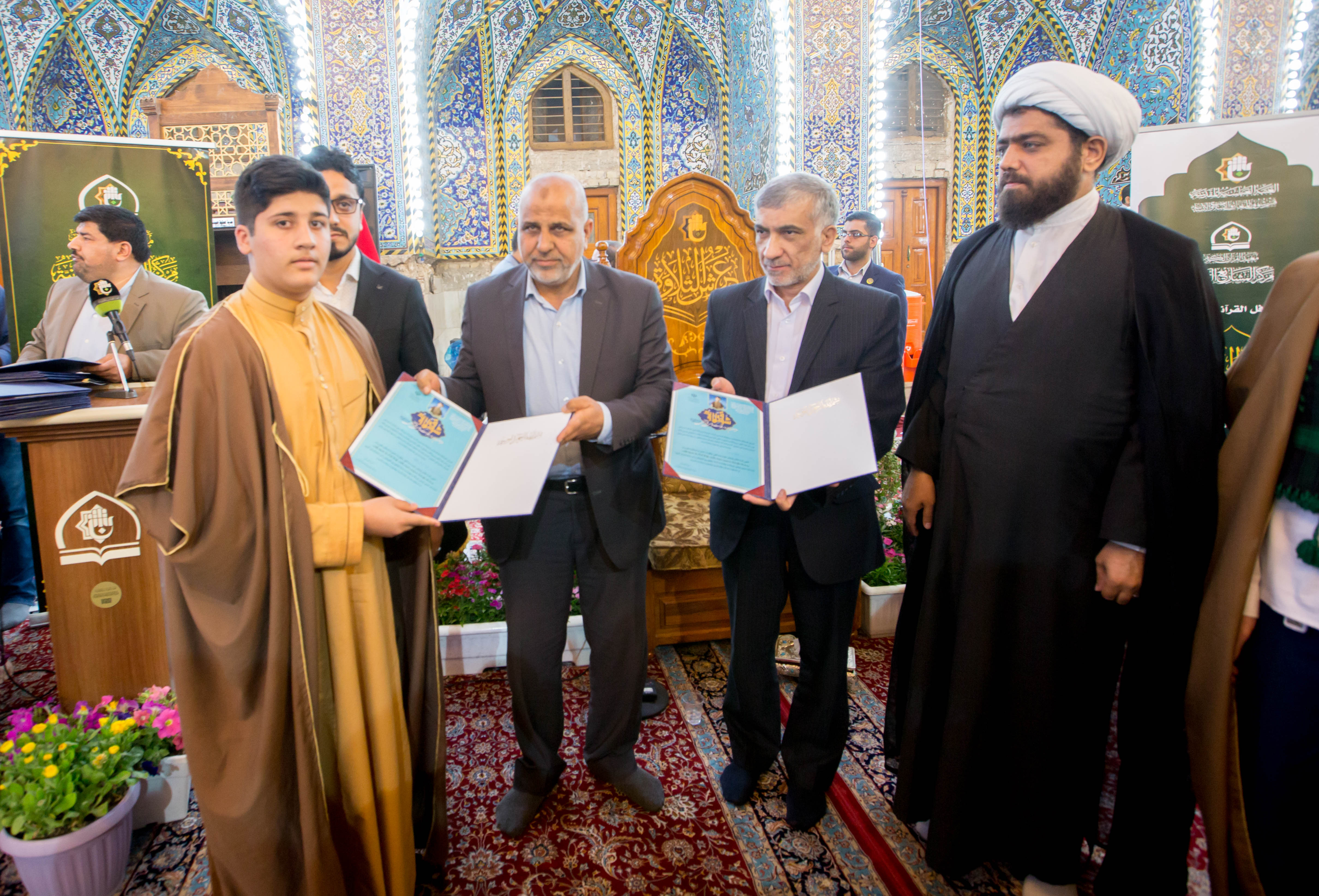 أقام مركز المشاريع القرآنية في معهد القران الكريم التابع للعتبة العباسية المقدسة محفله القرآني الثاني ضمن مشروع (عرش التلاوة) في الصحن العباسي المطهر وبحضور معاون وزير الثقافة والإرشاد الإسلامي في إيران (الدكتور فقهي زادة) وعدد من مسؤولي العتبة العباسية المقدسة، وايضاً وفد توأم مشروع أمير القراء الوطني في إيران (مشروع التلاوة الوطني) وجمع غفير من زائرين مرقد ابي الفضل العباس (عليه السلام). افتتح المحفل بتلاوة عطرة وعلى الطريقة العراقية تلاها الموهوب (محمد عباس) أحد طلبة مشروع أمير القراء الوطني، جاء بعدها تلاوة للبرعم الإيراني (محمد صادق صارمي) أحد براعم الوفد الضيف، تلتها تلاوة شنفت اسماع الحاضرين تلاها القارئ الدولي من جمهورية إيران (وحيد نظريان)، فيما جاء بعدها تلاوة للموهوب من أمير القراء (علي مرتضى)، وكان مسكاً للختام القارئ الإيراني الدولي (حامد علي زادة). وفي ختام الحفل تم توزيع الشهادات التقديرية على وفد توأم مشروع أمير القراء الوطني. يذكر أن مشروع (عرش التلاوة) الذي أطلقه مركز المشاريع القرآنية في معهد القرآن الكريم التابع للعتبة العباسية المقدسة مؤخراً يقام مساء كل يوم جمعة في رحاب الصحن العباسي المطهر ويستضيف عددٌ من القراء الدوليين.
