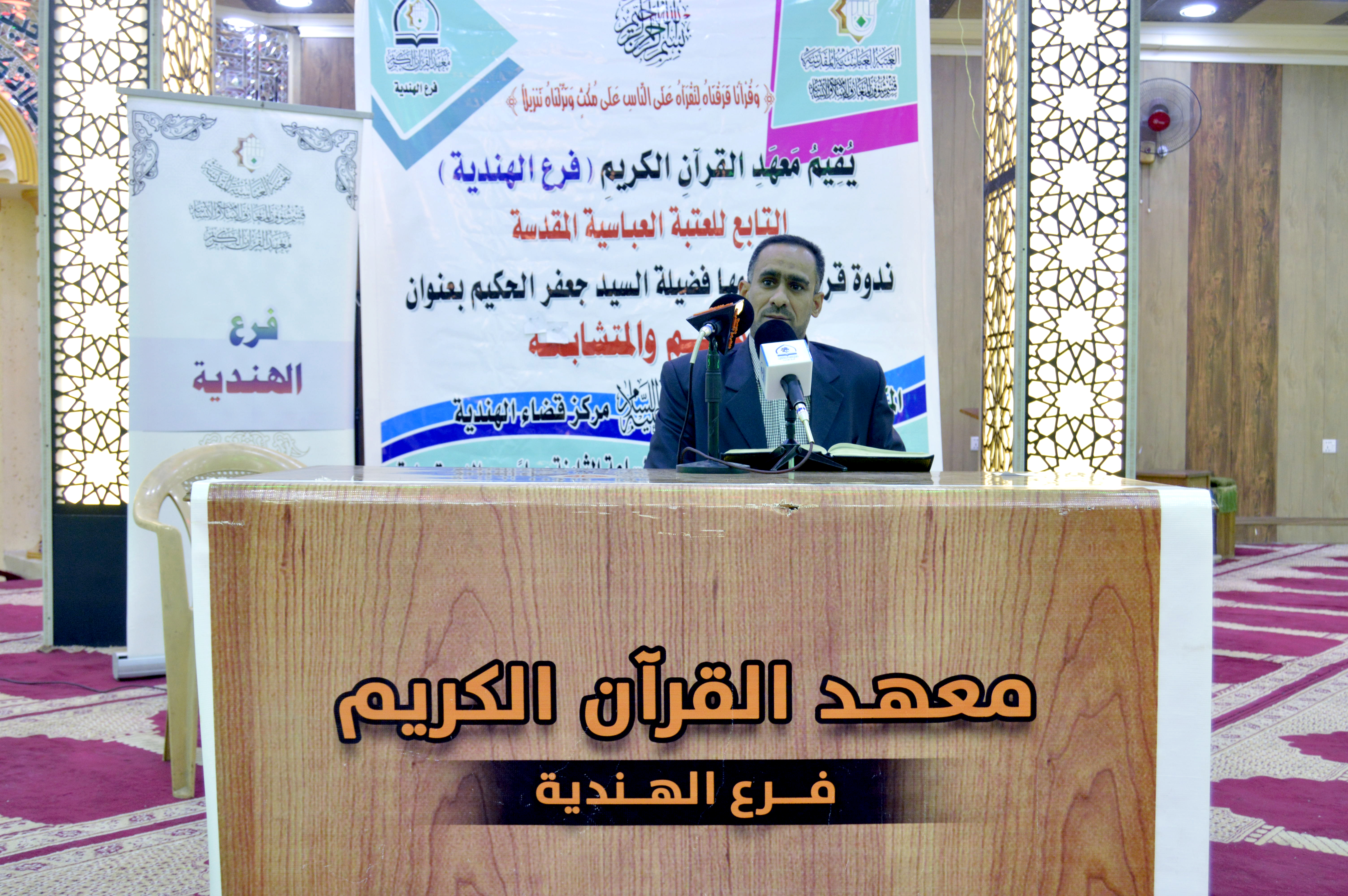 أقام معهد القرآن الكريم / فرع الهندية التابع لقسم شؤون المعارف الإسلامية والإنسانية في العتبة العباسية المقدسة ندوة قرآنية علمية تحت عنوان (المحكم والمتشابه في القرآن الكريم) قدّمها فضيلة السيد جعفر الحكيم في مضيف الإمام الحسين (عليه السلام) بمركز القضاء وحضرها عدد من الاساتذة والباحثين وطلبة العلوم الدينية والمهتمين بالشأن القرآني، وقد تناولت الندوة التعريف بالمحكم بأنه الثابت والمتشابه هو القابل للتغيير، وكانت هناك مداخلات قيمة وأسئلة من الحضور أجاب عنها فضيلة السيد جعفر الحكيم. يذكر أن معهد القرآن الكريم / فرع الهندية يقيم العديد من الدورات والندوات البحثية والقرآنية فضلاً عن الامسيات والمحافل التي يقيمها في المناسبات المختلفة.