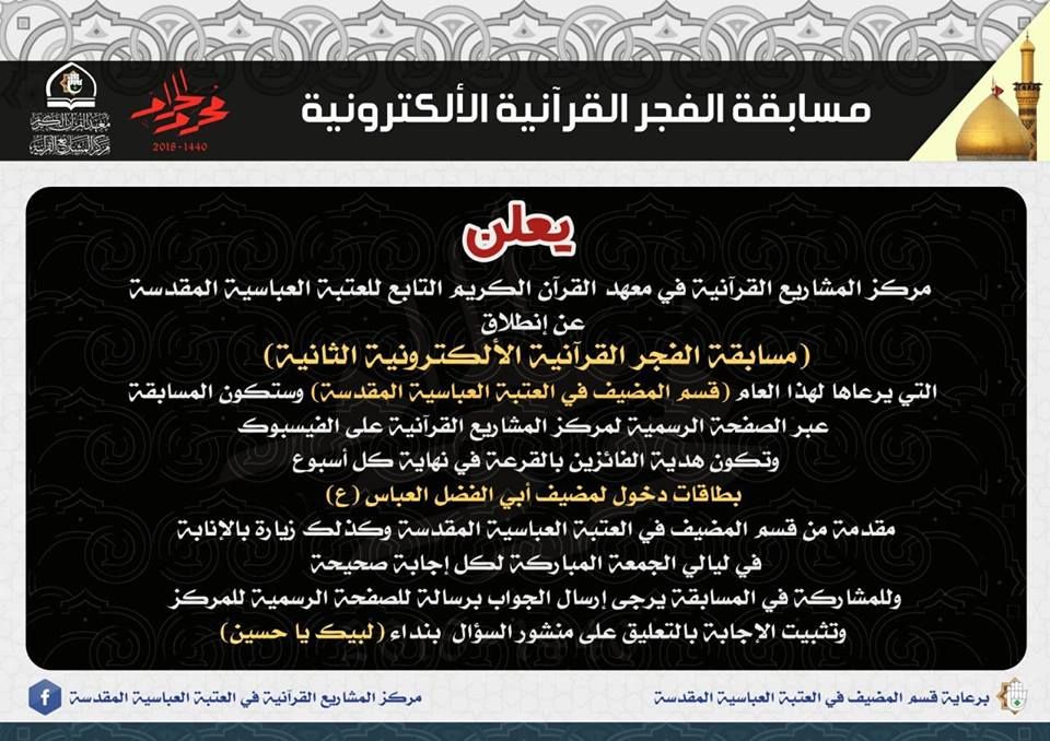 اقام مركز المشاريع القرآنية في معهد القرآن الكريم التابع للعتبة العباسية المقدسة مسابقة الفجر القرآنية الإلكترونية الثانية وبرعاية قسم المضيف في العتبة العباسية المقدسة والمسابقة تطرح اسئلتها عبر الصفحة الرسمية لمركز المشاريع القرآنية على الفيسبوك، وتكون هدية الفائزين بالقرعة في نهاية كل أسبوع بطاقات دخول لمضيف أبي الفضل العباس (ع) مقدمة من قسم المضيف، وكذلك زيارة بالإنابة في ليالي الجمعة المباركة لكل إجابة صحيحة وللمشاركة في المسابقة ترسل الاجوبة برسالة للصفحة الرسمية للمركز. يذكر ان مسابقة الفجر القرآنية الالكترونية تقام وللسنة الثانية على التوالي من قبل مركز المشاريع القرآنية من اجل نشر الوعي والمعلومة القرآنية بين اواسط المجتمع وتجذير هذه الثقافة عند الجميع.