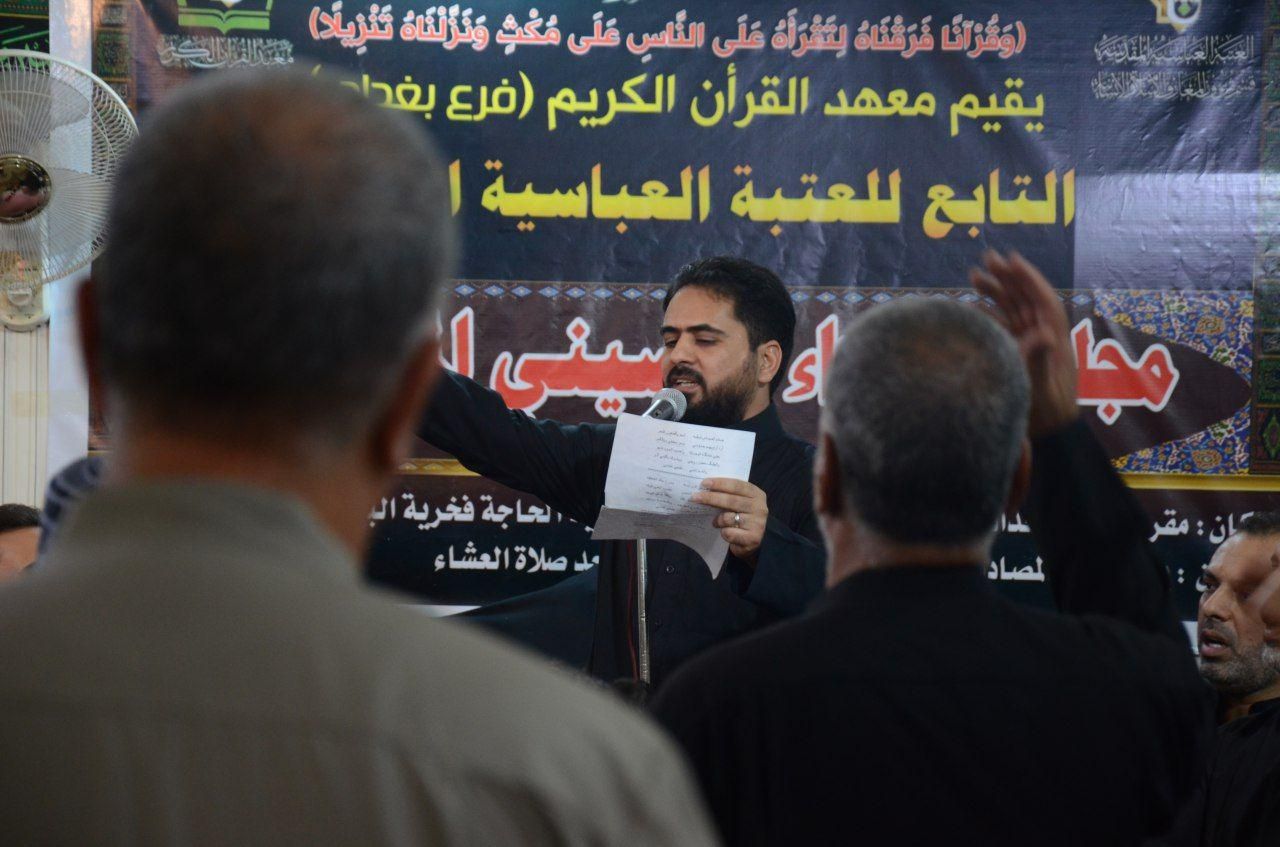 اقام معهد القران الكريم / فرع بغداد التابع للعتبة العباسية المقدسة مجلس العزاء الحسيني المركزي بذكرى دفن الأجساد الطاهرة وتعظيماً للشعائر في جامع وحسينية الحاجة فخرية البيرماني وسط العاصمة بغداد وذلك في ١٣ محرم ١٤٤٠هـ، بحضور جمع غفير من المؤمنين ومحبي الكتاب العزيز، استهل المجلس بتلاوة مباركة تلاها القارئ علي جواد، اعقبها محاضرة عقائدية دينية قدمها الخطيب السيد كاظم الموسوي التي بين من خلاها دور القرآن الكريم في معركة الطف وسبب خروج الامام الحسين (عليه السلام) من اجل اصلاح الامة وانتهاجها على طريق الصواب واولها الثقلين وهما الكتاب والعترة التي اوصى بهما جده رسول الله (صلى الله عليه وآله) وكان له في نبيه اسوة حسنة، ثم عرج كيف تستفاد الامة من الحسين الذي كان منهاجه الكتاب المبين فلابد ان نكون من المتمسكين لذلك الكتاب والعاملين به والسائرين على منهج اهل البيت (عليهم السلام). جاء بعدها التعازي لمصيبة الحسين واهل بيته (عليهم السلام) بقراءة القصائد الحسينية التي ألقها الرادود أحسان الغزي بكلماته التي لامست قلوب المؤمنين وهيي تفيض بالحرارة على أمامهم وما جرى عليه من مصيبة في كربلاء، ثم أختتم المجلس بدعاء الفرج وقراءة سورة الفاتحة على ارواح المؤمنين.