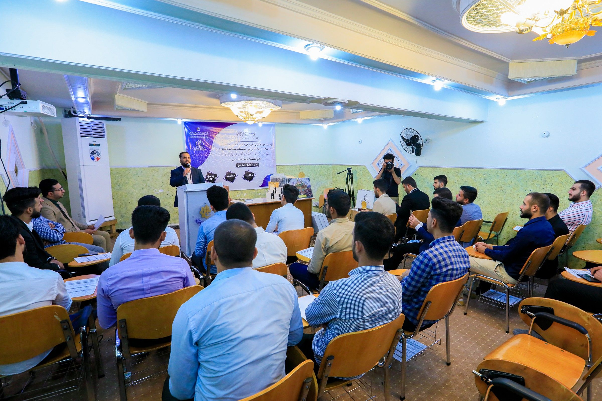 أقام معهد القرآن الكريم التابع للعتبة العباسية المقدسة حفل ختام دورة المرتضى (عليه السلام) التخصصية التي أقيمت ضمن المشروع القرآني في الجامعات والمعاهد العراقية بمشاركة (45) طالباً يمثلون معظم محافظات العراق. الحفل أقيم صباح اليوم السبت الأول من شهر ذي الحجة والذي يوافق بذكرى زواج النورين - أمير المومنين وسيدة نساء العالمين عليهما السلام – وقد استهل بتلاوة عطرة، ثم كلمة الجنة المشرفة على المشروع قدمها عضو اللجنة الأستاذ محمد الطيار بين خلالها أهداف المشروع الكثيرة التي من أبرزها اعداد اساتذة وحملة للقرآن الكريم ينشرون نوره في اروقة جامعاتهم وبين أخوتهم الشباب كما يسعى المشروع إلى نشر فكر وثقافة الثقلين الشريفين. مضيفاً: أن الدورة تضمنت دروساً مكثفة في علوم القرآن الكريم، والعقائد، والفقه، وطرائق التدريس، والحفظ الموضوعي والعديد من البرامج الاثرائية والمعارف القرآنية المتنوعة. كما وجه شكره للقائمين على العتبة العباسية المقدسة والأساتذة الذين بذلو جهوداً مباركة طيلة ايامها والعاملين في معهد القرآن الكريم. تلتها كلمة لطلبة الدورة قدمها ممثلاً عنهم الطالب زيد الرماحي شكر خلالها معهد القرآن الكريم على تقديمه هذه الفرصة المهمة جداً على حد تعبيره مبيناً ان الدورة قدمت لهم الكثير من المعلومات القرآنية المهمة وهم بدورهم سيسعون جاهدين لنقلها ونشر شذاها في أروقة جامعاتهم. في ختام الحفل تم تكريم الأساتذة وتوزيع الهداية والشهادات على الطلبة المشاركين في الدورة.