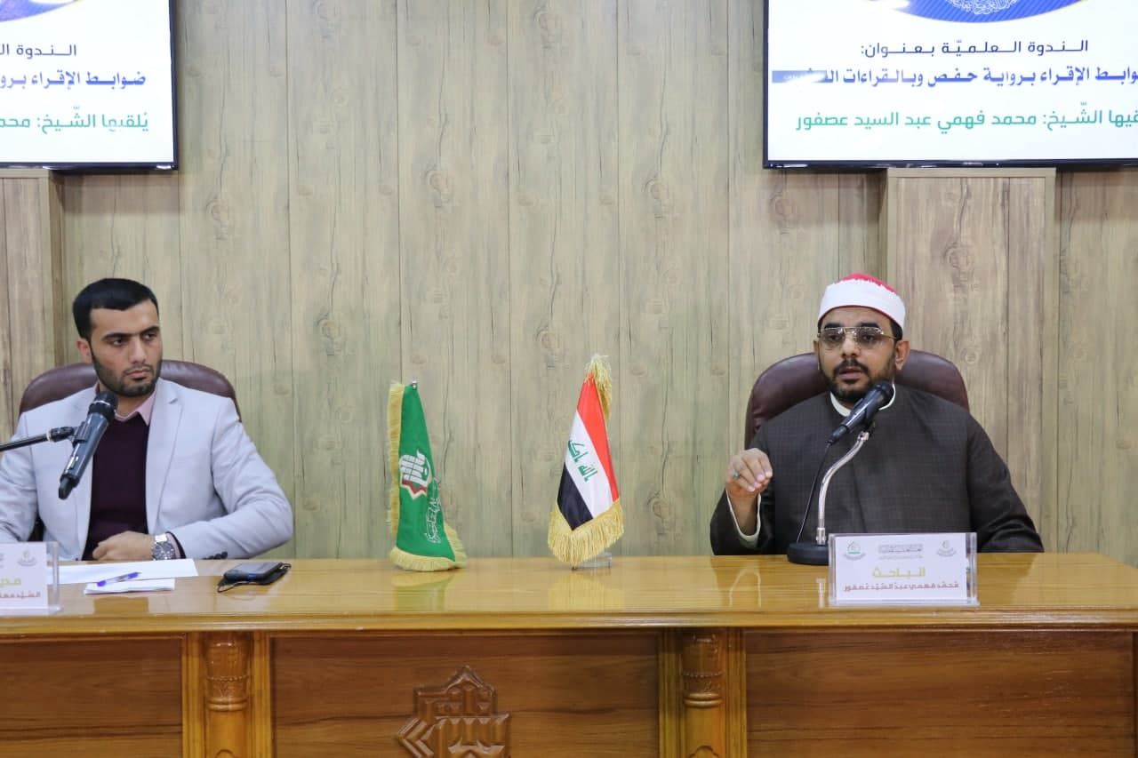 عَقَدَ معهد القرآن الكريم فرع النجف الأشرف التابع للعتبة العباسية المقدسة ، ندوةً علميّةً تحت عنوان (ضوابط الإقراء برواية حفص وبالقراءات العشر)، حاضر فيها الشّيخ المقرئ محمّد فهمي عبد السيّد عصفور من جامعة الأزهر جمهورية مصر. الندوة أقيمت في مقر فرع المعهد، وافتتحت بتلاوة مباركة تلاها القارئ احمد الزاملي، اعقبها كلمة ترحيبية لمسؤول فرع النجف الأشرف السيد مهند الميالي، رحب خلالها بالمحاضر الذي وفد من جمهورية مصر العربية، شرع بعدها المحاضر ببحثه الذي قدم فيه معلومات كثيرة تهتم بشرح كيفية القراءة بالقراءات العشر المشهورة عند المسلمين. يذكر ان الفرع اقام الندوة بشروط وقائية شهدت التباعد المكاني ولبس الكمامات وتعفير أماكن الحضور.