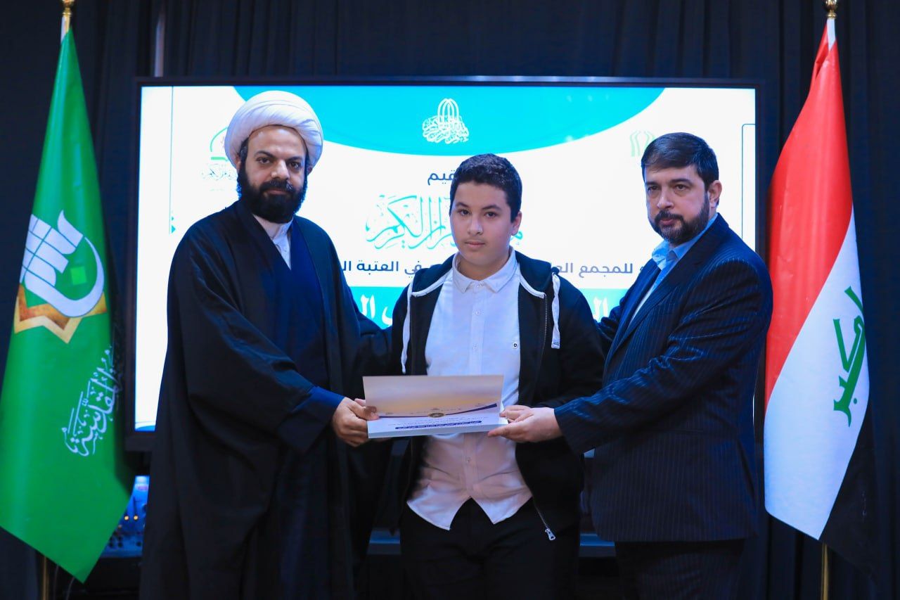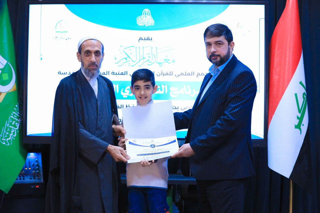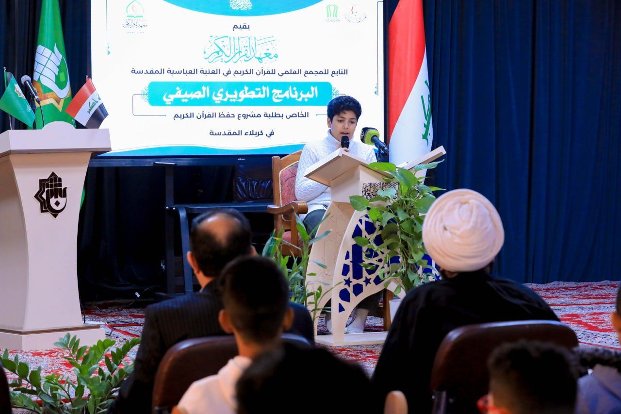 أقيم صباح اليوم الموافق 19/11/2022م حفل اختتام البرنامج التطويري الصيفي لطلبة مشروع حفظ القرآن الكريم في كربلاء المقدسة الذي أقامته وحدة التحفيظ في معهد القرآن الكريم التابع للمجمع العلمي للقرآن الكريم في العتبة العباسية المقدسة، وشارك فيه (40) طالبًا واستمر لمدةِ ثلاثةِ أشهرٍ تلقى خلالها الطلبةُ دروسًا مكثّفةً في حفظِ كتابِ اللهِ العزيزِ بهدفِ زيادةِ حفظِهم وتثبيتِ الحفظِ السابقِ.rnافتتح الحفل بتلاوة آيٍ من الذكر المبين تلاها أحد طلبة المشروع الطالب (محمد جعفر)، تلتها كلمة المجمع العلمي للقرآن الكريم ألقاها رئيسه الأستاذ الدكتور (مشتاق العلي)rnلمشاهدة الكلمة كاملة : https://alkafeel.net/quran/news?i=1395rnrnrnتلتها مشاركة شعرية لأحد براعم المشرع بقصيدة حسينية، أعقبها فقرة لطلبة البرنامج استعرضوا فيها مهارتهم في الحفظ من خلال الإجابة على أسئلة الحضور، وختامًا تم تكريم أساتذة البرنامج والطلبة المشاركين.rnيذكر ان البرنامج قدم فيه دروسًا مكثفةً في حفظِ كتابِ اللهِ العزيزِ بهدفِ زيادةِ حفظِهم وتثبيتِ الحفظِ السابقِ، بواقع فترتين صباحية ومسائية وتضمن محاضراتٍ تربويةً وأوقاتٍ للرياضةِ والراحةِ، ويوفرُ لطلبته وجباتٍ غذائيةً، وشهدَ سفراتٍ لزيارةِ المراقدِ المقدسةِ، والمرجعيةِ الدينيةِ في النجفِ الأشرفِ، وقدمت فيه هدايا تشجيعية للطلبة المتميزين فضلاً عن التحفيز المستمر الذي يقدّمه المعهدُ لطلبةِ مشروعِ حفظِ القرآنِ الكريم في كربلاء المقدسة والمحافظات.