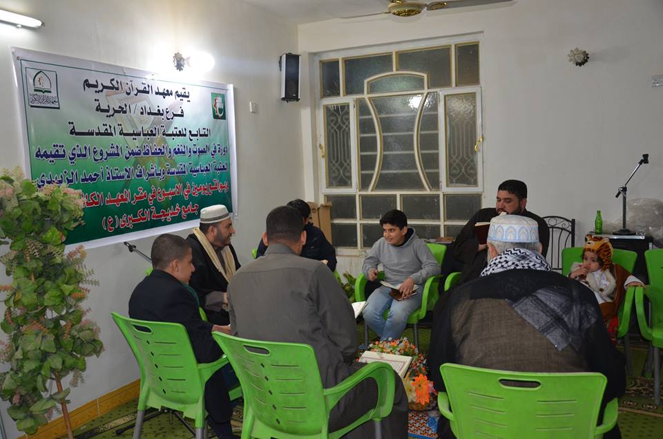 ضمن سعيه الحثيث والمتواصل في البحث عن أصوات قرآنية شابة تطل على السّاحة القرآنيّة المباركة ليعلو صداها وينشر عبيرها في فضاء الأمسيات والمحافل القرآنية في بغداد والمحافظات الاخرى ، أقام معهد القرآن الكريم فرع بغداد الحرية التّابع لمعهد القرآن الكريم لقسم شؤون المعارف الإسلامية والإنسانية في العتبة العباسية المقدسة، دورة في الصوت والنغم في مقر المعهد الكائن في جامع خديجة الكبرى(عليها السلام) وبإشراف الأستاذ أحمد الزبيدي. الدورة تكون بواقع يومين في الأسبوع فقط . يُذكر أنّ الفرع تبنى أقامة الكثير من الدورات المشابهة والتي تختص في الصوت والنغم القرآني .