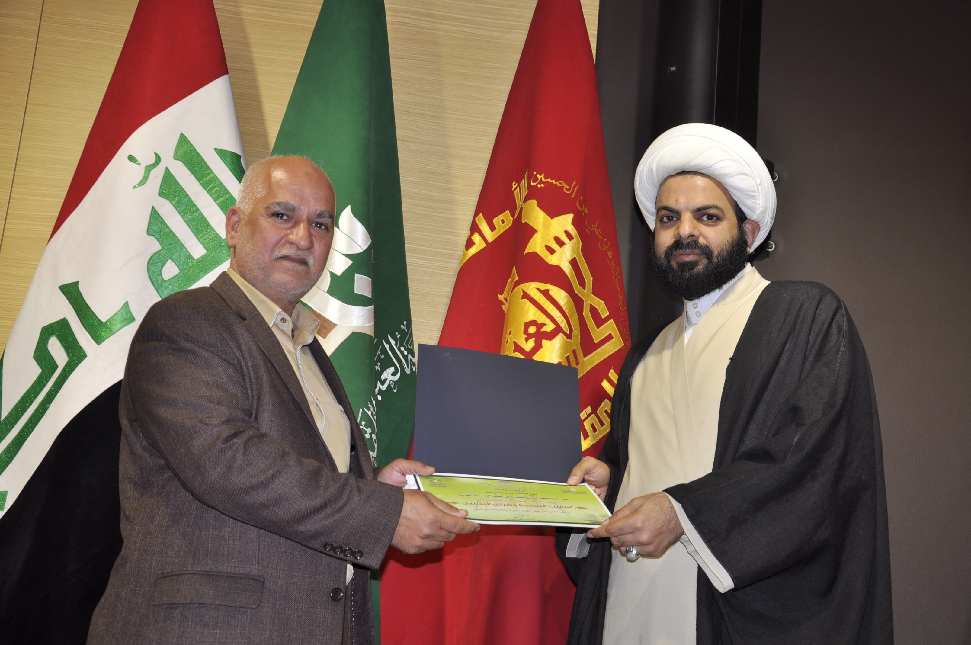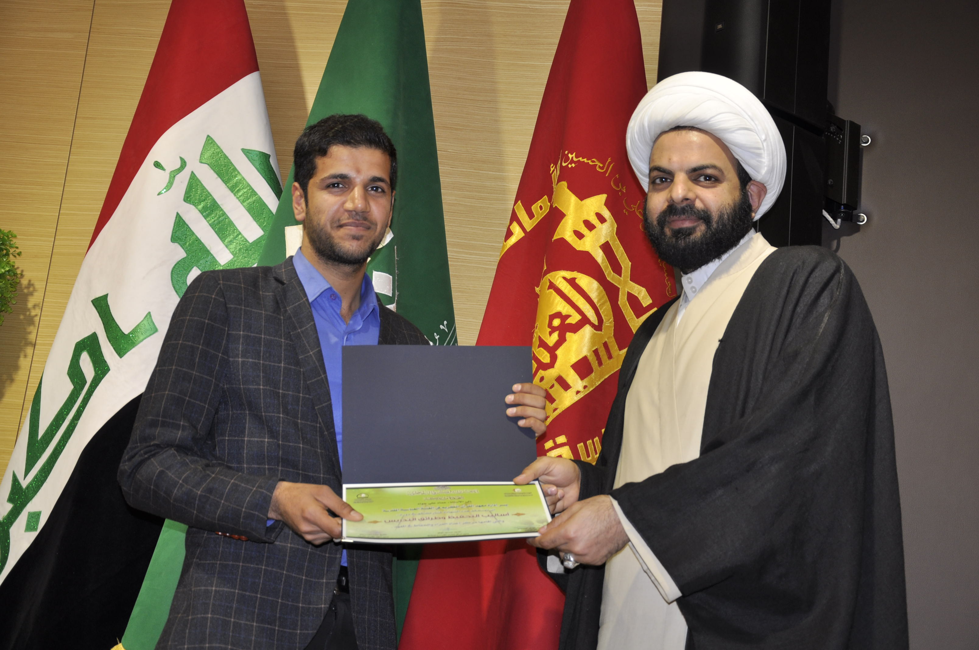 أقام معهد القرآن الكريم التَّابع لقسم شؤون المعارف الإسلاميّة والإنسانيّة في العتبة العبّاسيَّة المُقدّسة عصر يوم الثلاثاء 29 ربيع الثاني 1437هـ ، الموافق 9/شباط/2016م ، حفل أختتام الدورات التخصصيّة في أساليب التَّحفيظ وطرائق التدريس وكيفية إدارة دورات الحفظ، وذلك على قاعة الإمام الحسن (عليهما السلام) في العتبة العبَّاسيَّة المُقدَّسة، بحضور عدد من أساتذة معهد القرآن الكريم في مدينة كربلاء وبقية المحافظات. أستهل الحفل بتلاوة آيات بينات من الذكر الحكيم، تلتها كلمة الشيخ جواد النصراوي (سلمه الله) مدير معهد القرآن الكريم تحدث فيها عن فضل تعليم القرآن الكريم، وأهمية إقامة هذه الدورات وبين "إن هذه الدورات تُعَدُ بمثابةِ حجر أساس لإعداد منهج قرآنيّ متطوّر موضوعاً وشكلاً، فموضوعاتها دُوّنت وفق أسسٍ علميةٍ جديدةٍ، وأصولٍ سليمةٍ مستمدةٍ من القرآن الكريم، بوصفه منهجاً إرشادياً متكاملاً"، عقبها تسليم أستاذ الدورة السيد مهدي الحسيني هدية قيمة من إدارة معهد القرآن الكريم وتوزيع الشهادات التقديرية على الأساتذة المشاركين والتي كان بها مسك الختام. ومن الجدير بالذكر أن مركز إعداد القراء والحفاظ في معهد القرآن الكريم قد أقام دورات تخصصية شارك فيها عدد من أساتذة التحفيظ في معهد القرآن الكريم وفروعه في المحافظات، أستمرت للفترة من 4-9 شباط 2016 ، تلقّى فيها المشاركون دروساً نظرية وعملية في أساليب التَّحفيظ، وطرائق التّدريس، وكيفية إدارة دورات الحفظ، حيث تهدف هذه الدورات التّخصصيَّة إلى إعداد أساتذة متميزين في تحفيظ القرآن الكريم، وتطوير قدراتهم من خلال اتباع أساليب جديدة، وطرائق فنّيّة ونموذجيّة معدّة بأسلوب علميّ حديث.