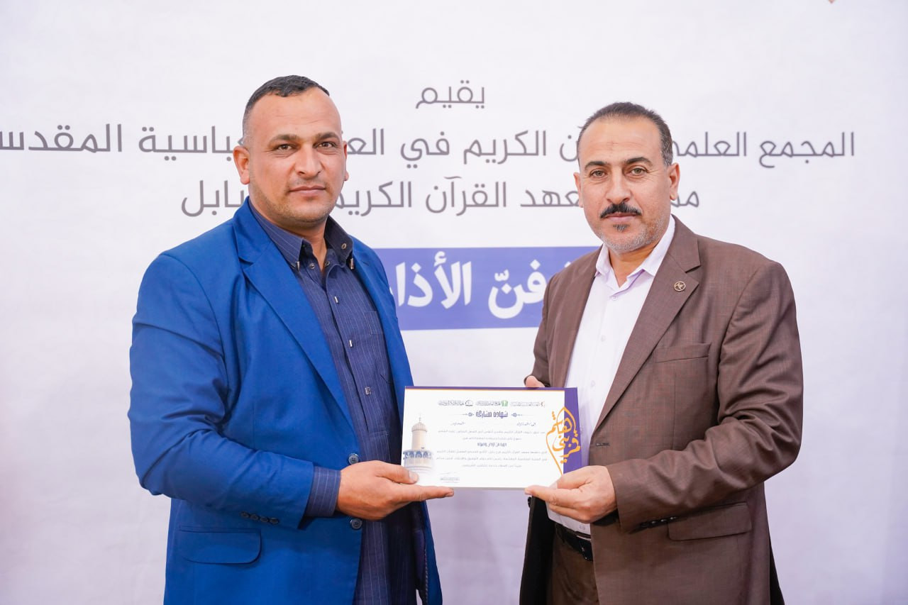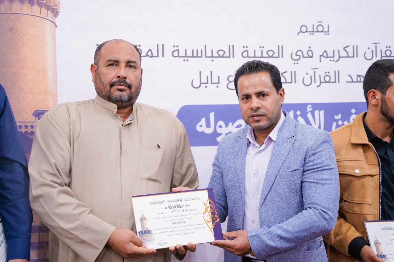 اختتم المَجمَع العلميّ للقرآن الكريم في العتبة العبّاسية المقدّسة، ممثّلًا بمعهد القرآن الكريم فرع بابل، دورةَ فنّ الأذان وأصوله في ناحية سدة الهندية، بمشاركة مجموعةٍ من المهتمين بالنداء العبادي وفنون أدائه. وقال مسؤولُ الفرع السيدُ منتظر المشايخي: "شهد حفلُ الختام إقامةَ مسابقةٍ تطبيقية بين المتدرّبين، أسفرت نتائجُها عن فوز المتسابق عبد الله عزيز إبراهيم بالمركز الأول، فيما نال المتسابق نبيل حسين سعيد المركز الثاني، وحلّ المتسابق مصطفى يعقوب داود في المركز الثالث، بعد منافسةٍ عكست مستوى الجهد والتدريب الذي تلقّاه المشاركون طوال أيام الدورة". وأكد المشايخي: "تأتي هذه الدورة ضمن سلسلة البرامج القرآنية التي يواصل المعهد تنفيذها في مناطق محافظة بابل، بهدف تنمية المهارات الصوتية لدى المؤذنين، وترسيخ مفاهيم الأذان الصحيح وفق الأصول الفنية والعبادية".