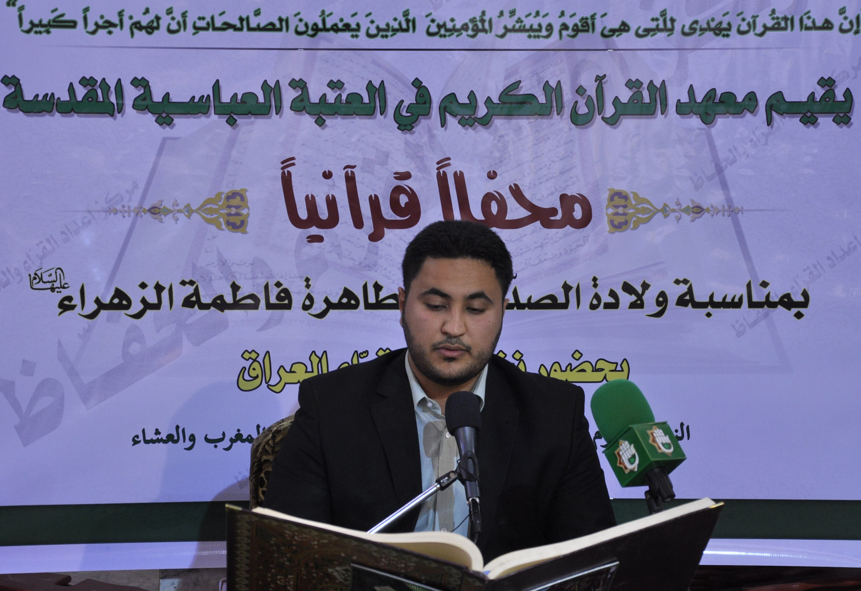 لسيّدتنا ومولاتنا فاطمة الزهراء(عليها السلام) علاقةٌ خاصّةٌ بالقرآن الكريم فقد كان ملازماً لها، حيث وُصِفَت (عليها السلام) بليلة القدر، وجاء في خطبتها(عليها السلام) في المسجد: (...عباد الله أنتم نصب أمره ونهيه، وحملة دينه ووحيه، وأمناء الله على أنفسكم، وبلغاؤه الى الأمم زعيم حقّ له فيكم، وعهد قدّمه اليكم، وبقيّة استخلفها عليكم: كتاب الله الناطق، والقرآن الصادق، والنور الساطع، والضياء اللامع، بيّنةٌ بصائره، منكشفةٌ سرائره، منجليةٌ ظواهره، مغتبطةٌ أشياعه، قائدٌ الى الرضوان أتباعه، مؤدٍّ الى النجاة استماعه، به تُنال حجج الله المنوّرة، وعزائمه المفسّرة، ومحارمه المحذّرة، وبيّناته الجالية، وبراهينه الكافية، وفضائله المندوبة، ورخصه الموهوبة، وشرائعه المكتوبة...). ومن هذا المنطلق وتوثيقاً لهذه العلاقة وإحياءً لذكرى مولدها العطر، أقام معهدُ القرآن الكريم التابع للعتبة العباسية المقدّسة مساء يوم الجمعة (20جمادى الآخرة 1436هـ) الموافق لـ(10نيسان2015م) وسط أجواء فرحٍ وسعادةٍ غامرة ومن الرحاب الطاهرة لصحن أبي الفضل العباس(عليه السلام) محفلاً قرآنياً اشترك فيه نخبةٌ من القرّاء وهم (القارى مصطفى الحمدان والقارئ موسى شاكر الرديني ،والقارئ باقر الزيدي والبرعم المتميز علي هادي باقر)، وشهد حضوراً فاعلاً ومشاركةً كبيرةً من قبل زائري المرقد الطاهركما شهد المحفل مسابقة قرآنية وزعت على الحاظرين وبعد ختام المحفل اجريت القرعة لاصحاب الاجابات الصحيحة وكرم (10) منهم. يُذكر أنّ معهد القرآن الكريم بالإضافة إلى هذه الدورة فإنّه يُقيم العديد من الأمسيات القرآنية ويعمل على الاهتمام بالطاقات القرآنية للموهوبين من الأطفال والناشئة والشباب والعمل على تنمية تلك الطاقات في الحفظ والتلاوة والتفسير وتقديم كافة التسهيلات لها, والتعاون مع المؤسّسات القرآنية الأخرى لتبادل الخبرات والمشاركة في المسابقات والمهرجانات الداخلية والخارجية منها, وإعداد المبلّغين في مجال القرآن من خلال فتح دورات تأهيل وإعداد معلّمي القرآن الكريم.