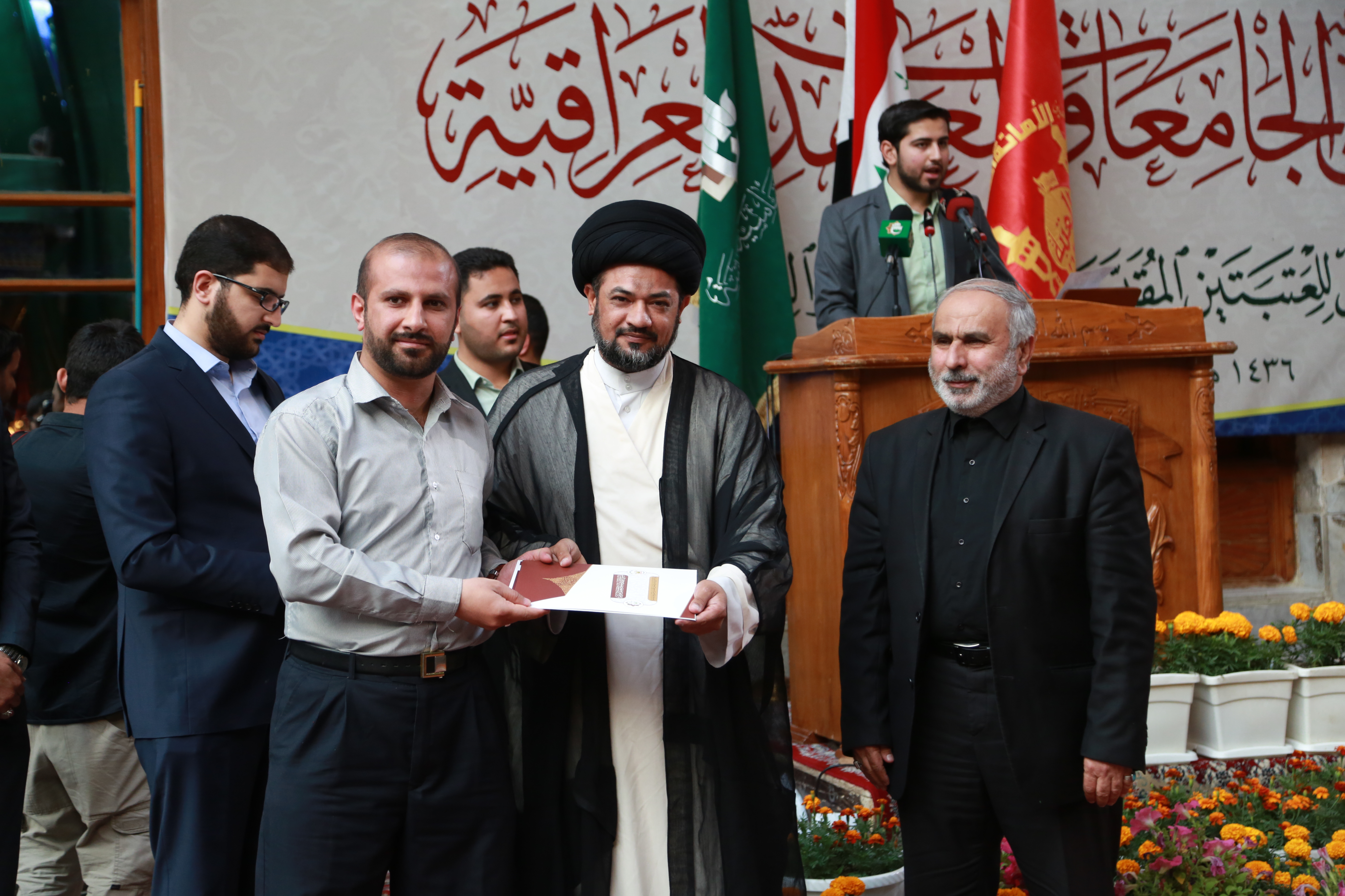 احتضن الصحنُ المطهّر لمرقد أبي الفضل العباس(عليه السلام) عصرَ اليوم الجمعة (12رجب 1436هـ) الموافق لـ(1آيار 2015م) حفل تخريج الدورات القرآنية ضمن المشروع القرآنيّ في الجامعات والمعاهد العراقية الذي يُقام برعاية العتبتين المقدّستين الحسينية والعباسية للسنّة الثانية على التوالي، ويأتي هذا الحفلُ الذي شهد تخرّج (2,000) ألفي طالبٍ تقريباً تزامناً مع ذكرى ولادة القرآن الناطق أمير المؤمنين علي بن أبي طالب(عليه السلام). استُهِلّ الحفلُ الذي شهدَ حضوراً كبيراً بتلاوةٍ مباركة من آيات الذكر الحكيم بصوت القارئ حسنين الحلو لتأتي بعدها كلمة العتبتين المقدّستين التي قام بإلقائها سماحة السيد أحمد الصافي والتي ذكر فيها: "إخواني الأعزّاء.. الإنسان في الدنيا يكتسب ويشتري ويحمل ثمّ بعد ذلك يحطّ هذا الرحال أمام جهة لتبدأ هذه الجهة تعزل الشيء غير النافع وتُخرج الشيء النافع الذي يستحقّ ألا وهو العمل الصالح، فالدّنيا عبارة عن سوق -كما يعبّر الحديث الشريف- ربح فيها قومٌ وخسر آخرون، والنبيّ الأعظم(صلى الله عليه وآله) وضع لنا حدوداً يجب أن لا نتعدّاها، وجعلها في جهتين لا تنفكّ إحداهما عن الأخرى ألا وهما القرآن الكريم والعترة الطاهرة، وبحمد الله تعالى حُفِظَ القرآن الكريم سواءً بالوعد الإلهي أو باهتمام النبيّ(صلى الله عليه وآله) والمسلمين وأيضاً العترة التي هي عدل القرآن أيضاً لابُدّ أن نعرفها والمعرفة هي مقدّمةٌ للعمل والتمسّك بهم، لأنّ الذي يتمسّك بالقرآن الكريم والعترة الطاهرة سيكون ثابتاً إذا هبّت عليه عاصفةٌ وسينجو إذا جاءه موجٌ ويريد أن يغرقه ولذلك شُبّهَ التمسّكُ بالعترة بسفينة نوح". وأضاف: "يا أبناءنا الطلبة أنتم في ريعان الشباب لذلك لابُدّ أن تتمسّكوا بالقرآن الكريم والعترة الطاهرة فهما المنجيان فقط، ولا يمكن أن نبحث عن نجاةٍ في غيرهما، والنبيّ أرحم بنا من أنفسنا فلو كان هناك غيرهما لبيّن لنا ذلك، ولكن كلّ الأحاديث الشريفة في النجاة تدور مدار العترة الطاهرة، فتارةً يتحدّث عن عليّ(عليه السلام) ويُبيّن (أنّ عليّاً مع الحقّ والحقّ مع عليّ) وتارةً يتحدّث عن الزهراء(عليها السلام) وتارةً يتحدّث عن الحسنين(عليهما السلام) وتارةً عن ذرّية الحسين(عليه السلام)، فتحديد العترة مقدّمةٌ للتمسّك، وبحمد الله تعالى أنتم ذوو بصائر والإنسان يحتاج البصيرة إخواني خصوصاً في زمنٍ قد تتشابه الأشياء وتشتبك عليه الرؤيا، لكن الذي يكون على بصيرةٍ لا يفرق عنده الحال، فالإنسان الذي يكون متنوّراً لا يمكن أن يقع في مدلهمّات الخطوب، ولعلّ من وظيفتنا الآن أن نشدّد على قضية البصيرة فنحن في زمنٍ شحّت فيه الأخلاق وتوسّعت فيه وسائل الإغراء، ولكن عندما تتمسّكون -أيّها الفتية- بالقرآن الكريم والعترة الطاهرة لاشكّ ستكونون من الذين تكون قلوبهم مطمئنّة". جاءت بعدها كلمةُ اللجنة المشتركة لرعاية المشروع القرآنيّ والتي ألقاها عضو اللجنة المذكورة الدكتور سالم جاري، حيث بيّن فيها: لابُدّ أن نعكف على القرآن الكريم علماً وتعلّماً وفهماً وتدبّراً وتفسيراً، كلٌّ بحسب ما مكّن اللهُ تعالى له لأنّه كما قال النبيّ الأكرم(صلى الله عليه وآله): (لا يلقينّ أحدكم ربّه وليس في جوفه شيءٌ من القرآن) فلابُدّ لنا أن يكون في جوف كلّ واحدٍ منّا شيءٌ منه ويجري على ألسنتنا، ومن هذا المنطلق ارتأت الأمانتان العامّتان للعتبتين المقدّستين الحسينية والعباسية وبمتابعةٍ دؤوبةٍ من المعنيّين في الأمانتين وفي كل من معهد القرآن و دار القرآن الكريم، وهيّأت لهذا المشروع مع ما يتناسب من الإمكانات المادية والمعنوية فنهض بإذن الله تعالى وببركة القرآن الكريم والعترة الطاهرة، فكان هذا العدد وهذه النخبة المباركة من الحفظة والمتعلّمين لأحكام التلاوة، وبحمد الله تعالى لم نجد ممانعةً من عموم الجامعات والكلّيات سواءً كانت إنسانية أو ذات علومٍ صرفة وغيرها، نسأل الله تبارك وتعالى أن يتمّ هذا المشروع في الأعوام القادمة". استمع الحاضرون بعدها الى تلاوات